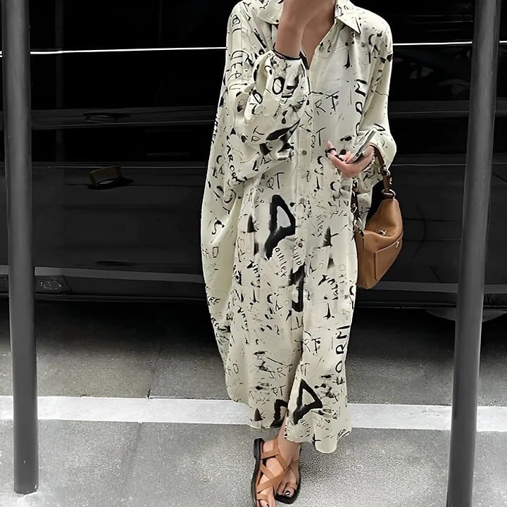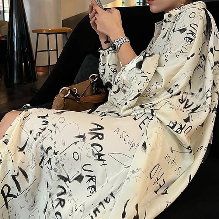 手書きタッチのプリントが遊びゴコロあるオーバーシャツワンピース。