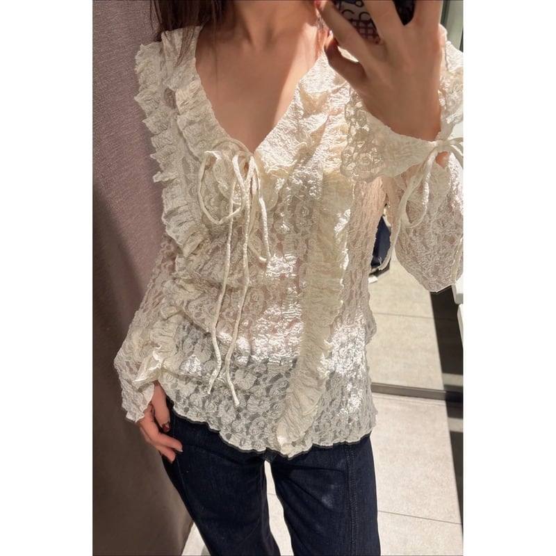 繊細なレース素材が女性らしさを引き立てるロングスリーブのトップス。