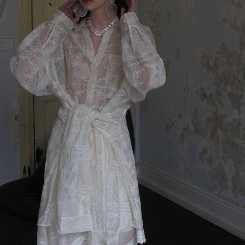 女性らしい花柄刺繍を施したシアーロングシャツ。
