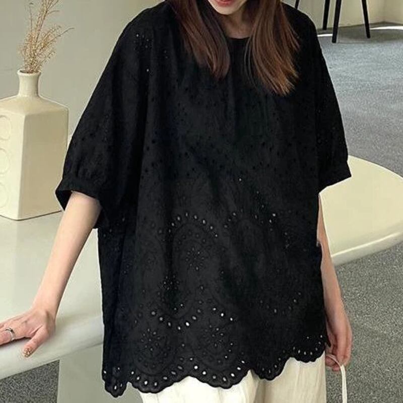 Scalloped lace oversized tops V2223