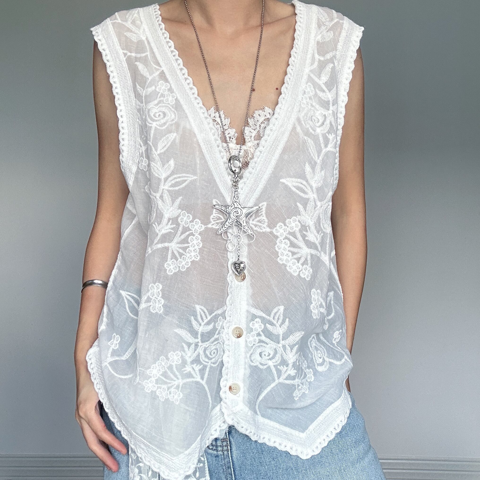 繊細な刺繍が施された涼し気なシアーベスト。