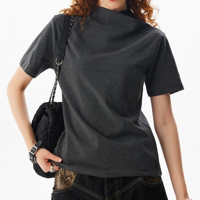 ドレープデザインのハイネックが魅力のTシャツ。