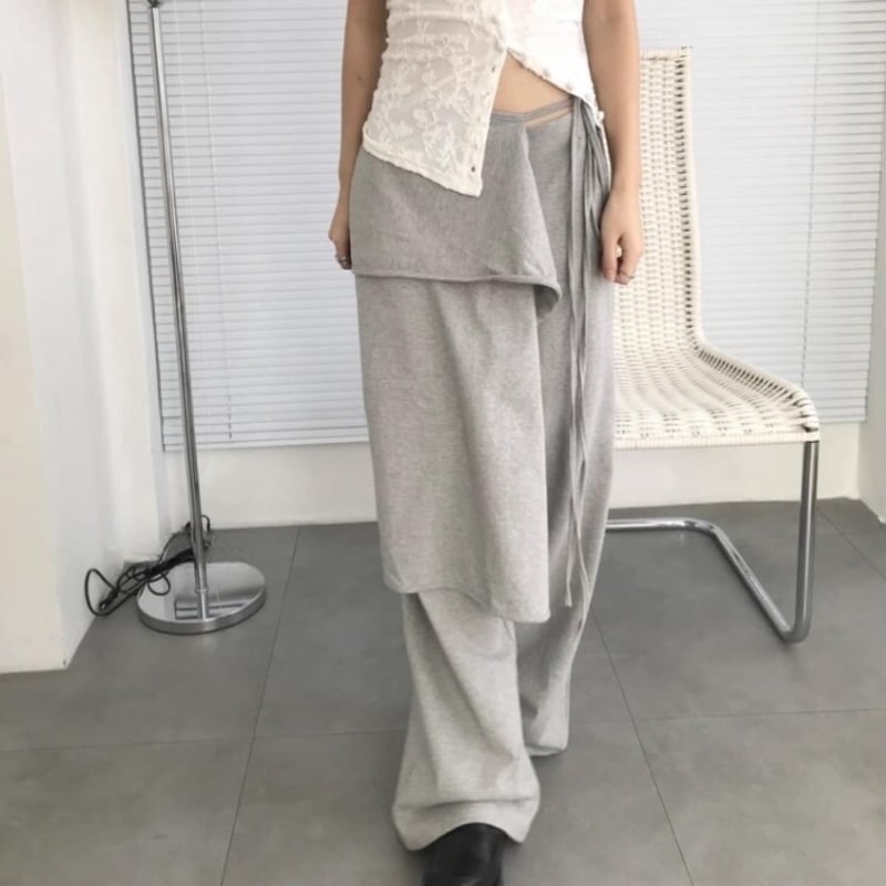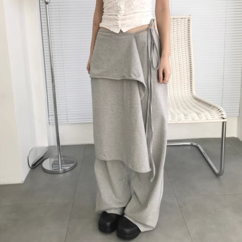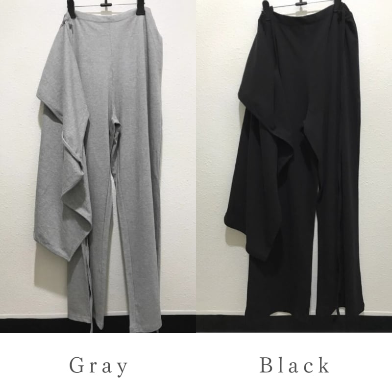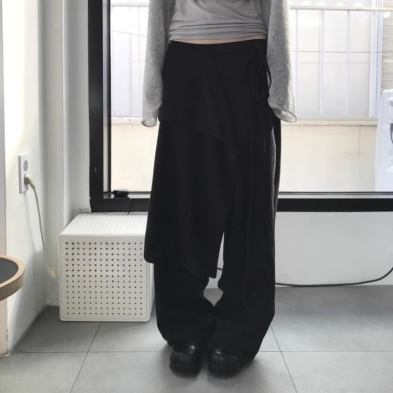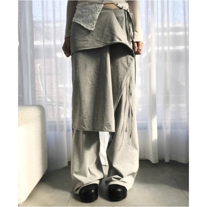 重ね着のようなデザインが魅力のラップスカートつきパンツ。