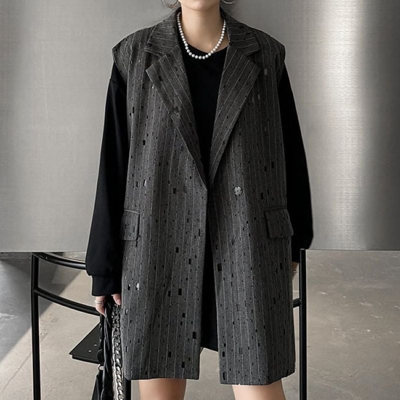 ストライプ柄とさりげないカットアウトデザインが魅力のジレ。
