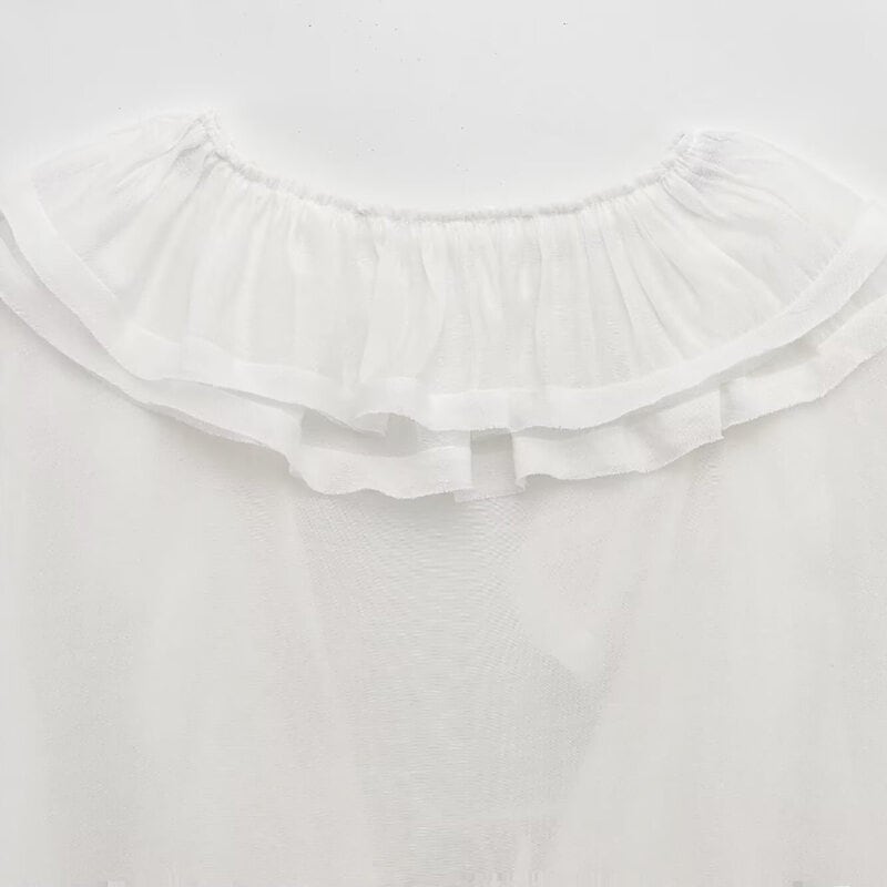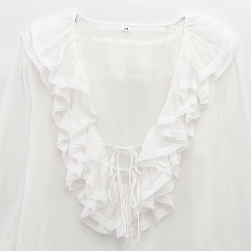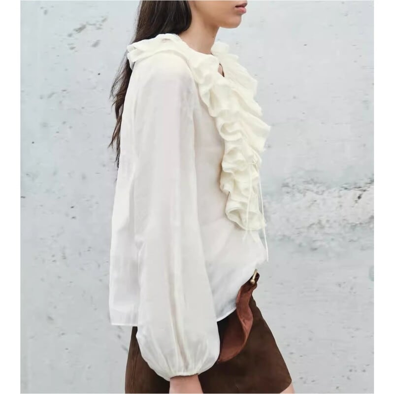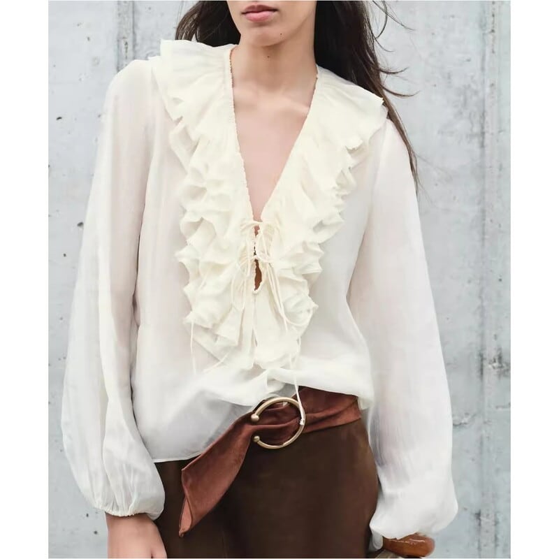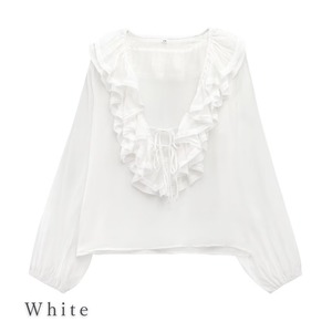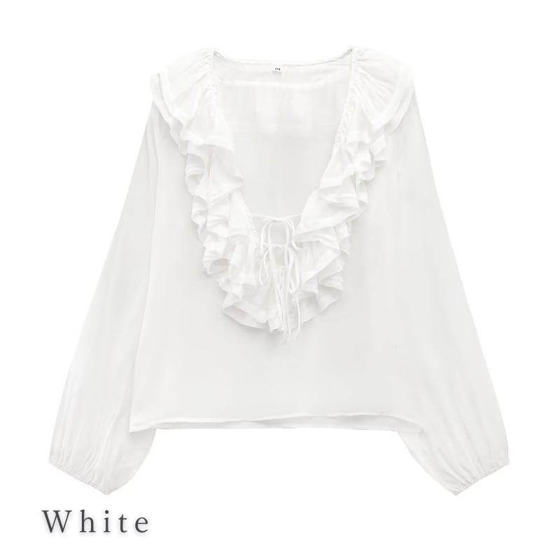 繊細なフリルが胸元を華やかに飾るブラウス。