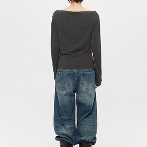 ボートネックのオフショルダー風デザインと