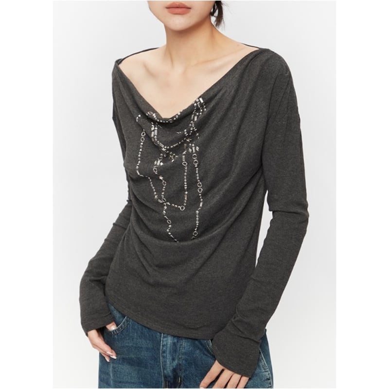 胸元にはチェーンプリントがあしらわれたトップス。