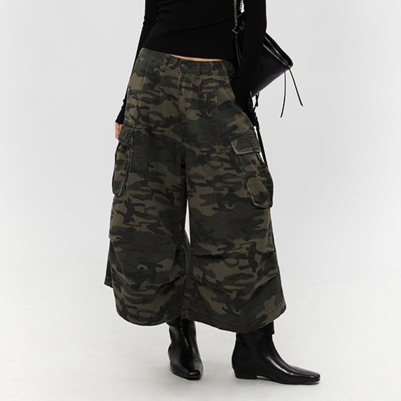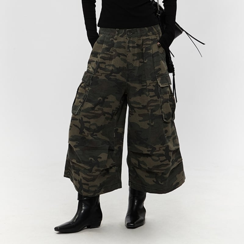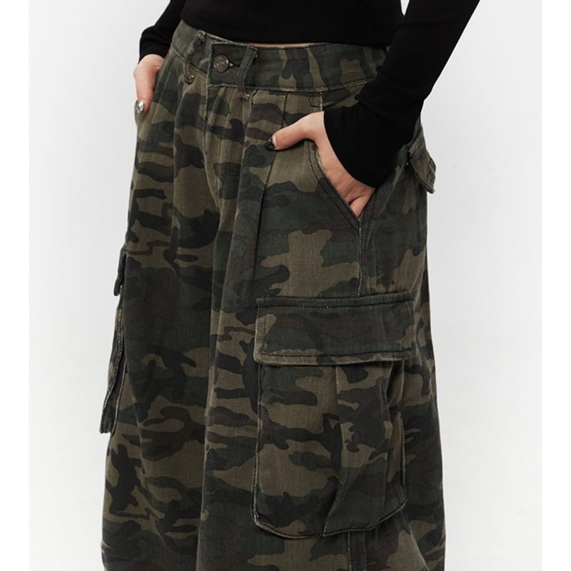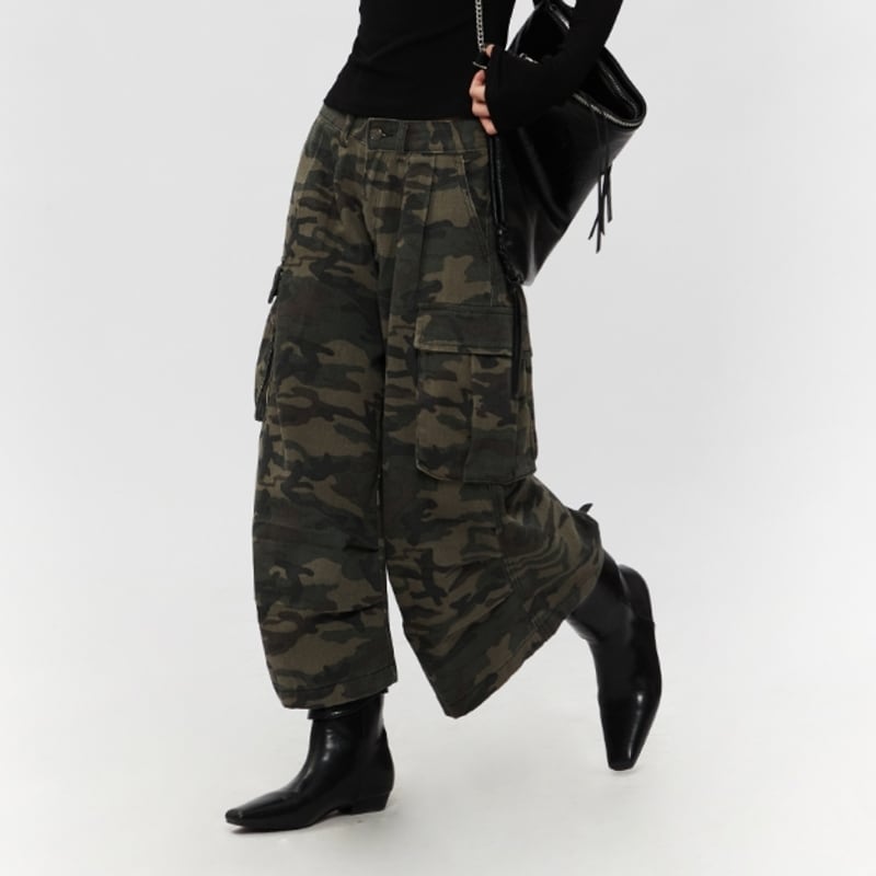 ミリタリーテイストのカモフラージュ柄カーゴパンツ。