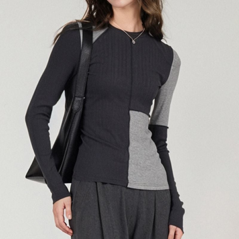 パッチワークデザインが目を惹くロングスリーブトップス。