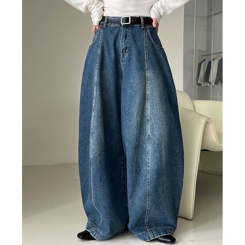 フロントの縦のステッチを効かせたワイドデニムパンツ。