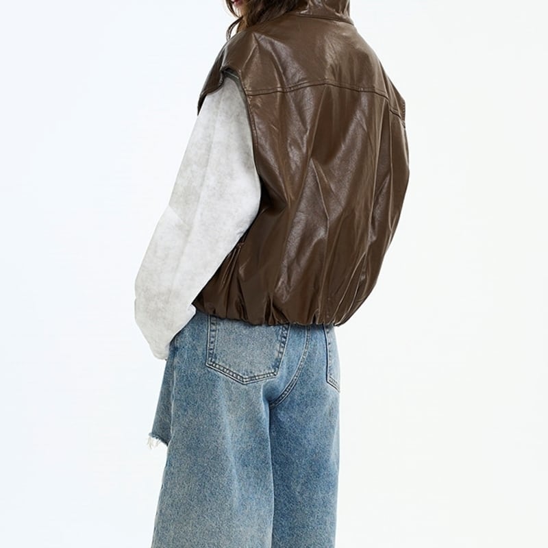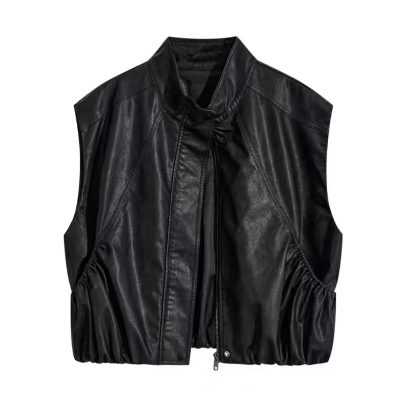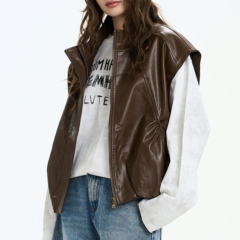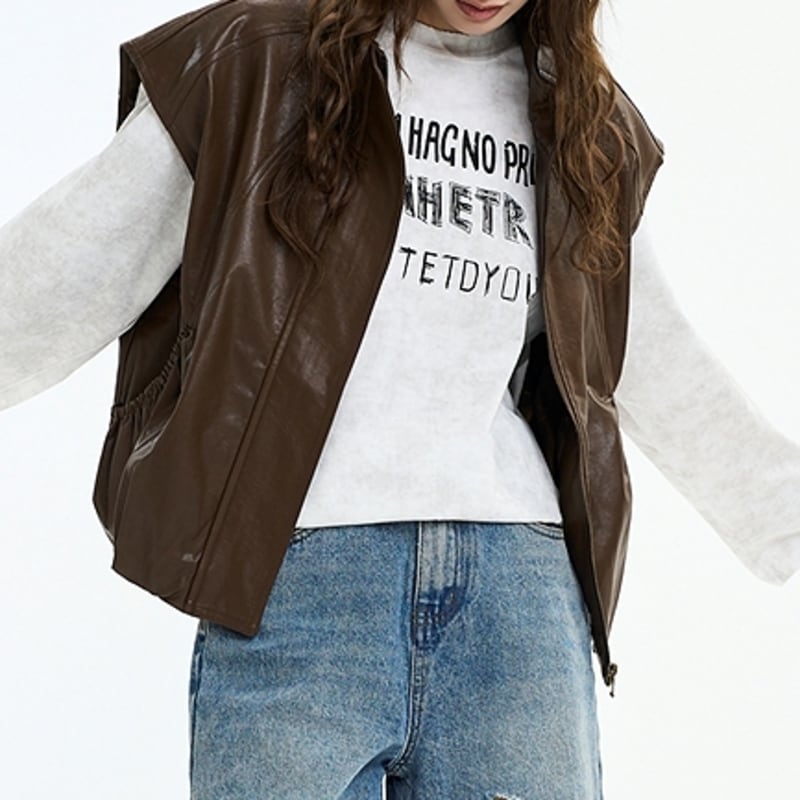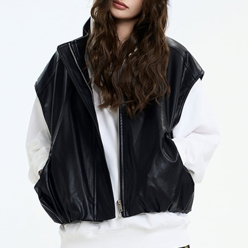 フェミニンな魅力をプラスしたフェイクレザーベスト。