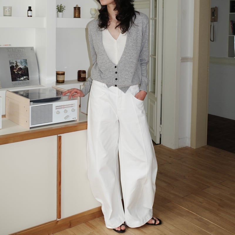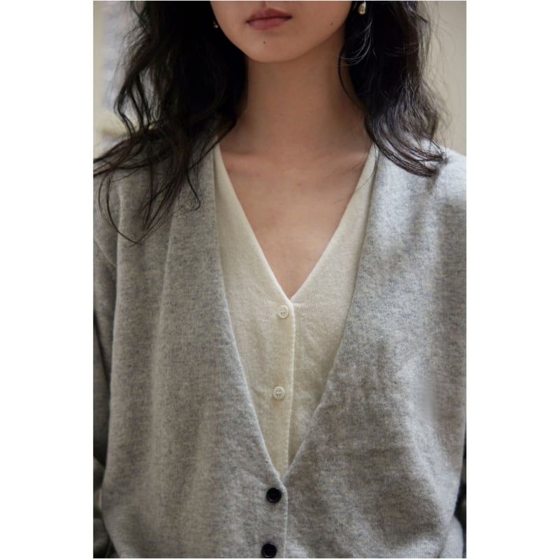 シンプルなVネックがデコルテまわりをすっきりとみせる
