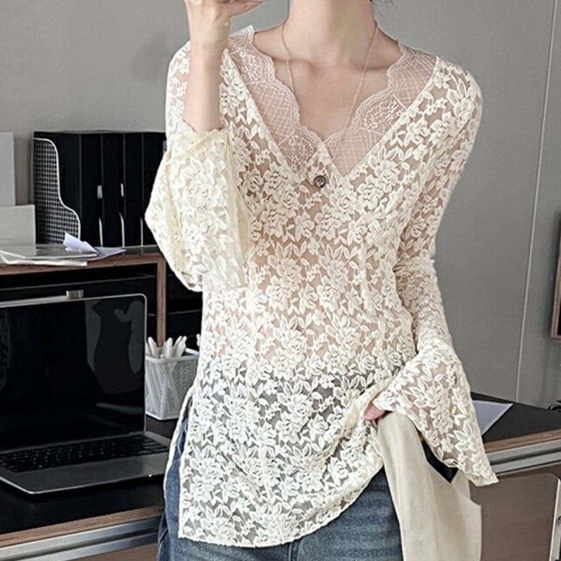 繊細なレースがフェミニンな印象のトップス。
