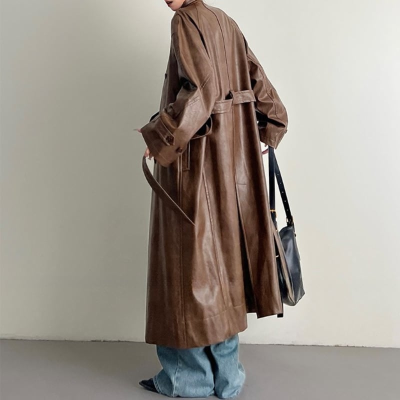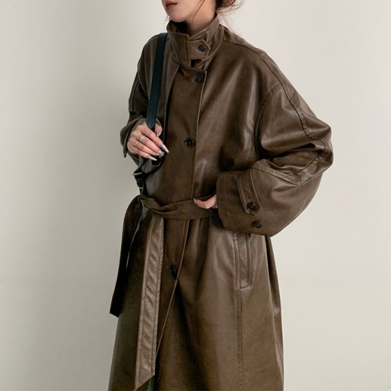 PUレザー仕立てのロングコート。
