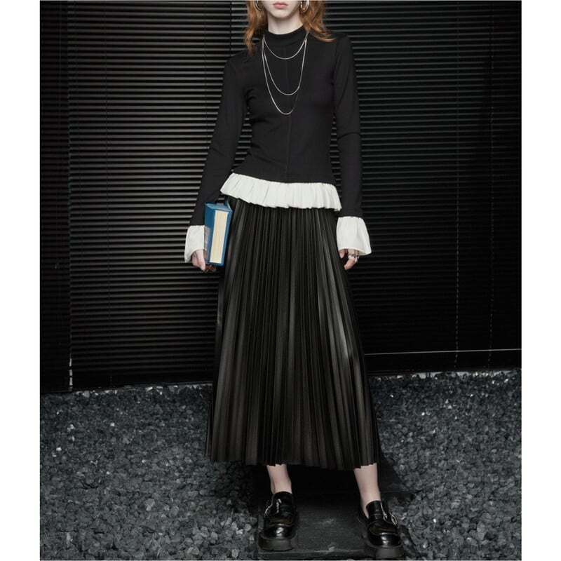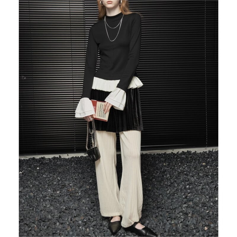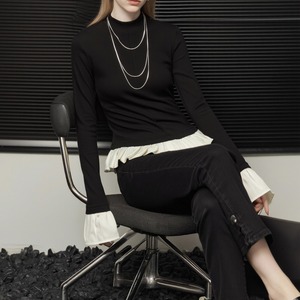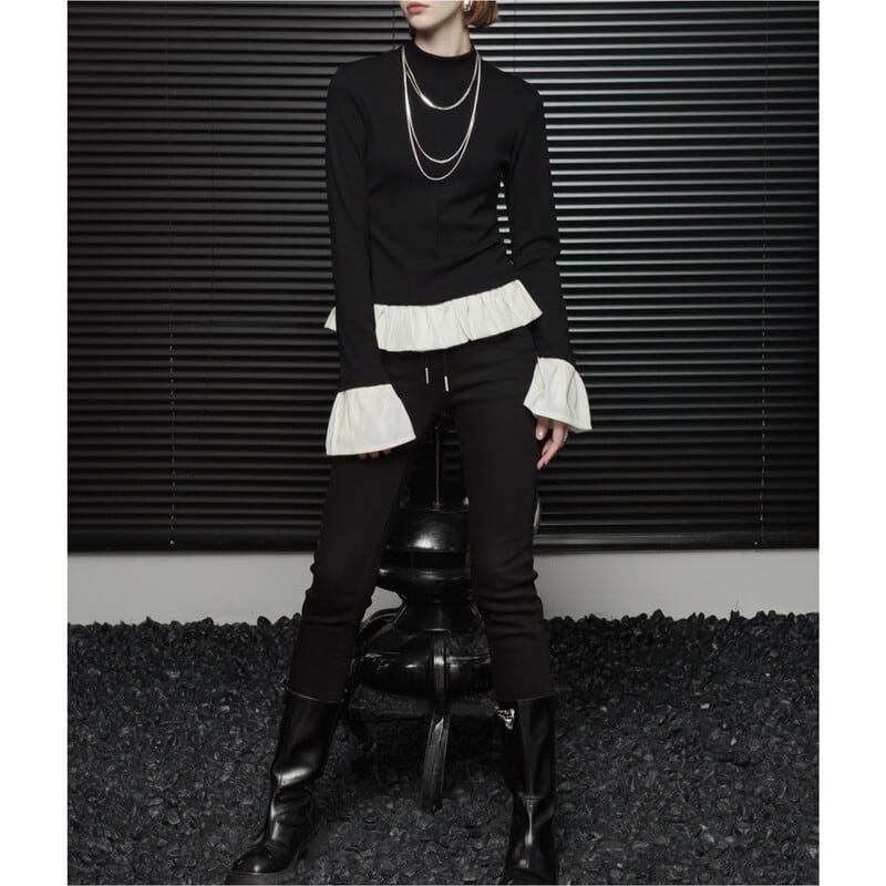 袖と裾にあしらわれたフリルが目を惹くトップス。