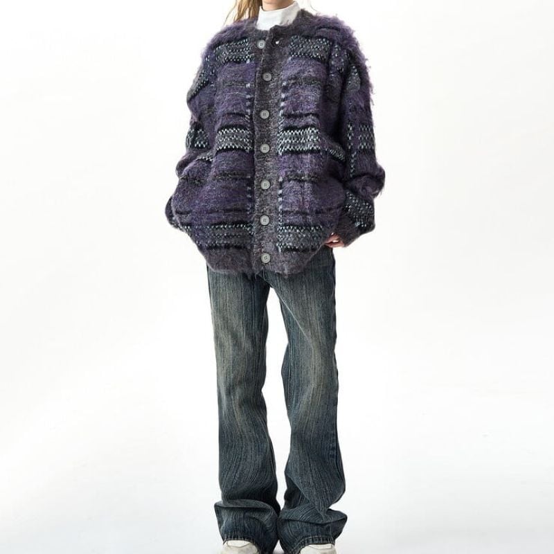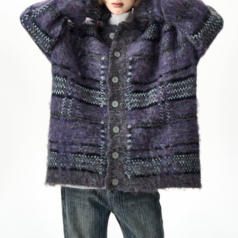 太めボーダーパターンのモヘアニットカーディガン。