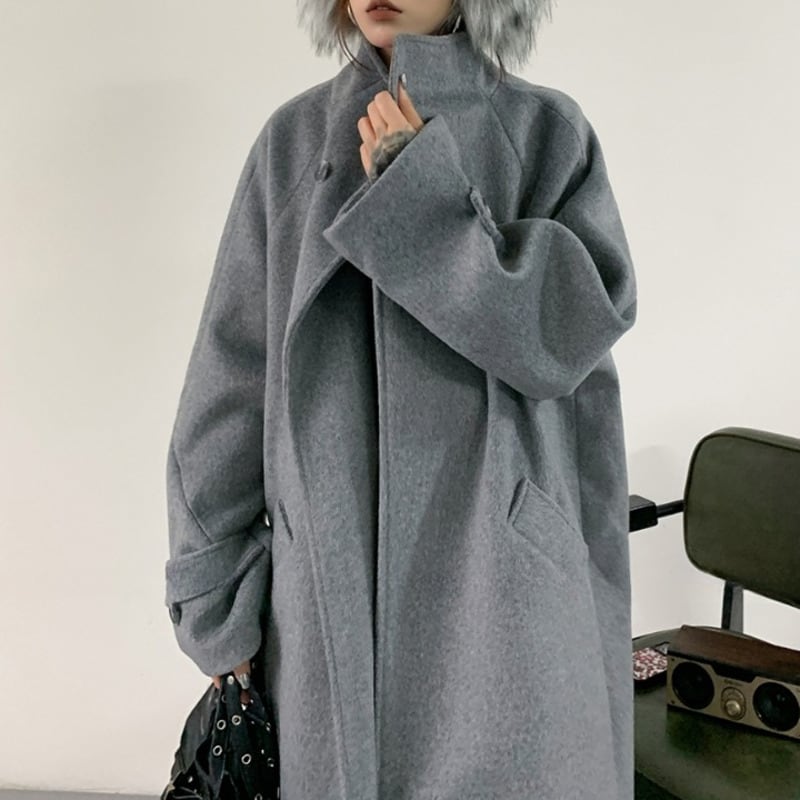 スタンドカラーが特徴的なオーバーサイズロングコート。