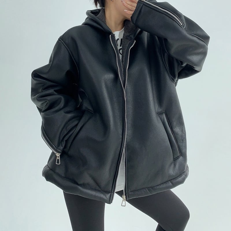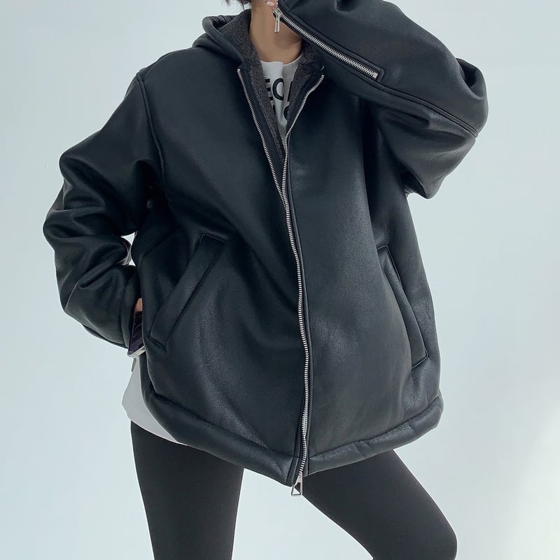 フード付きでカジュアルに着こなせるフェイクレザージャケット。