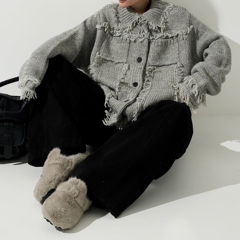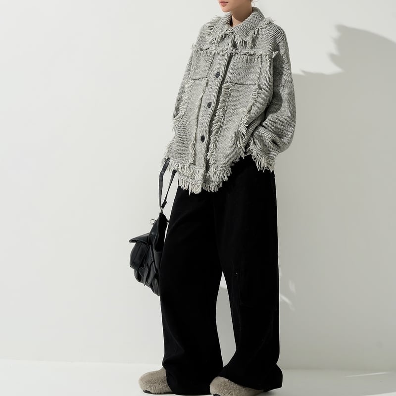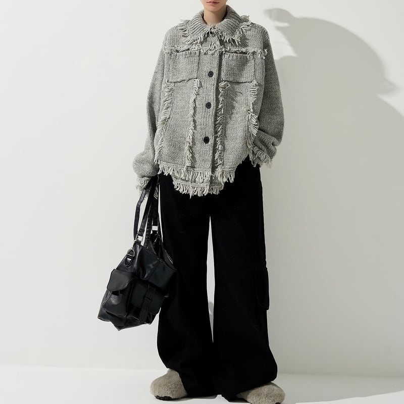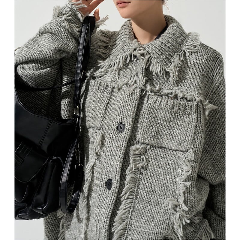 フリンジ使いが目を惹くニットカーディガン。