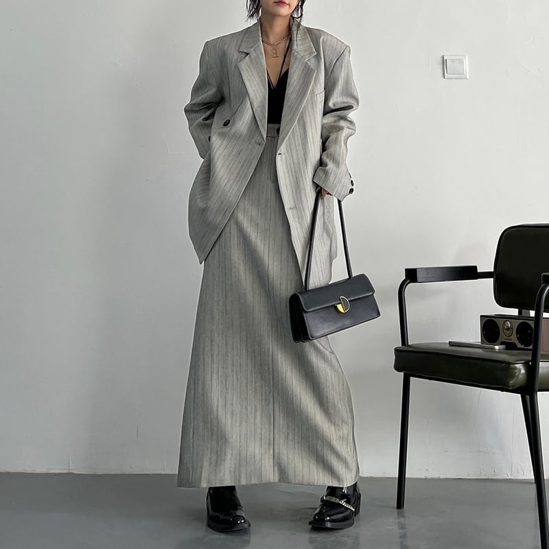 オーバーサイズジャケットとAラインスカート。