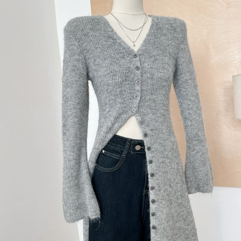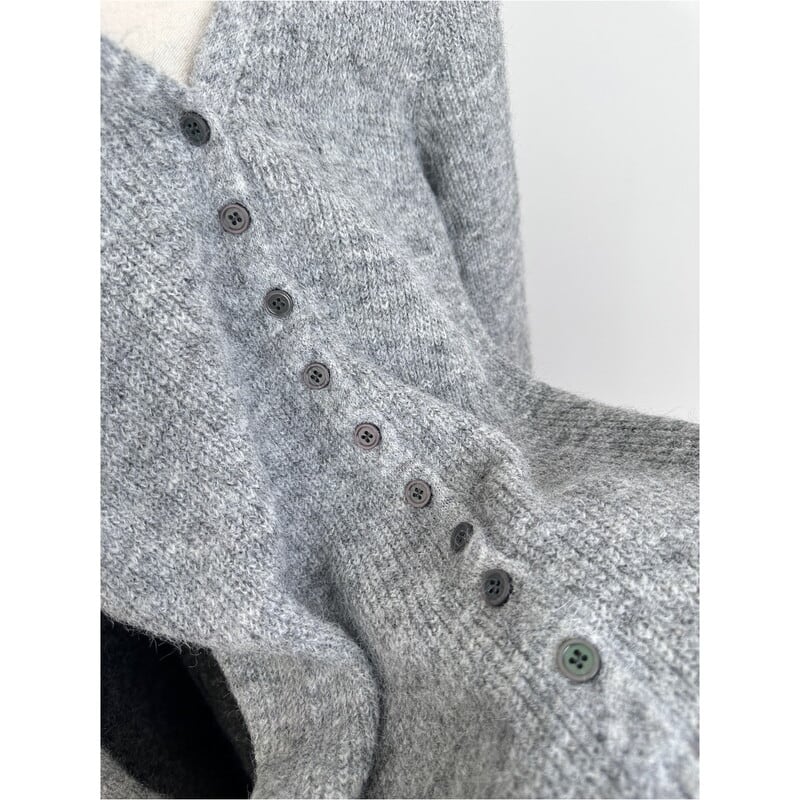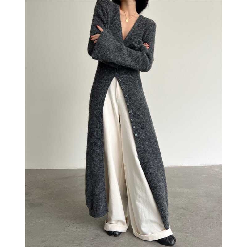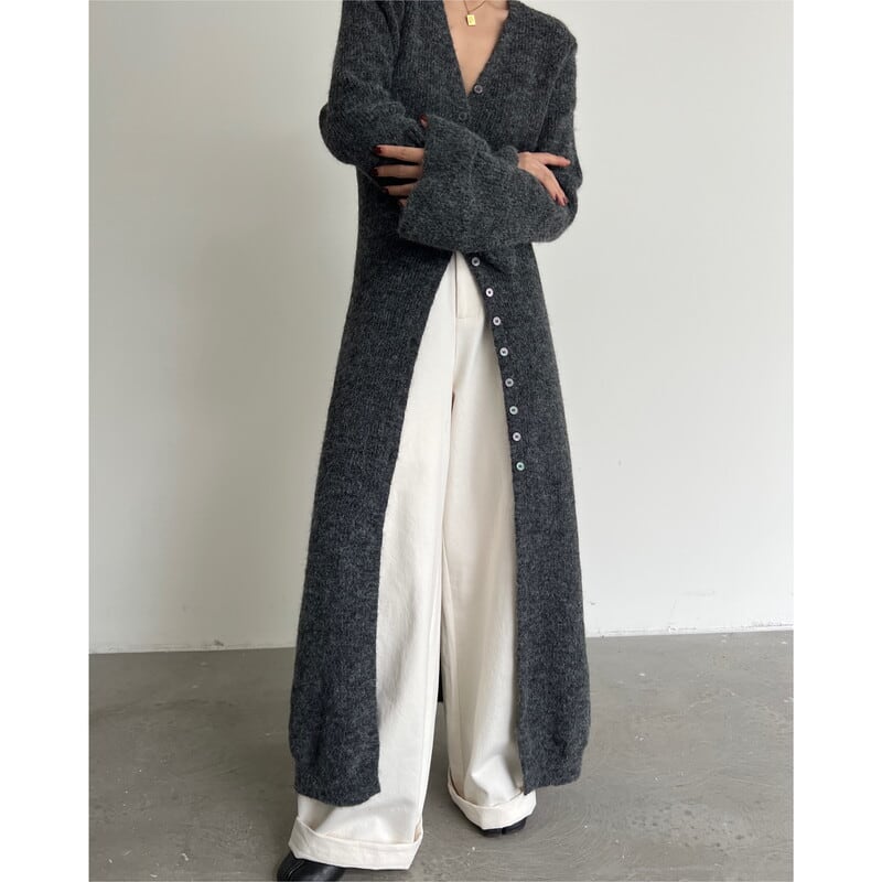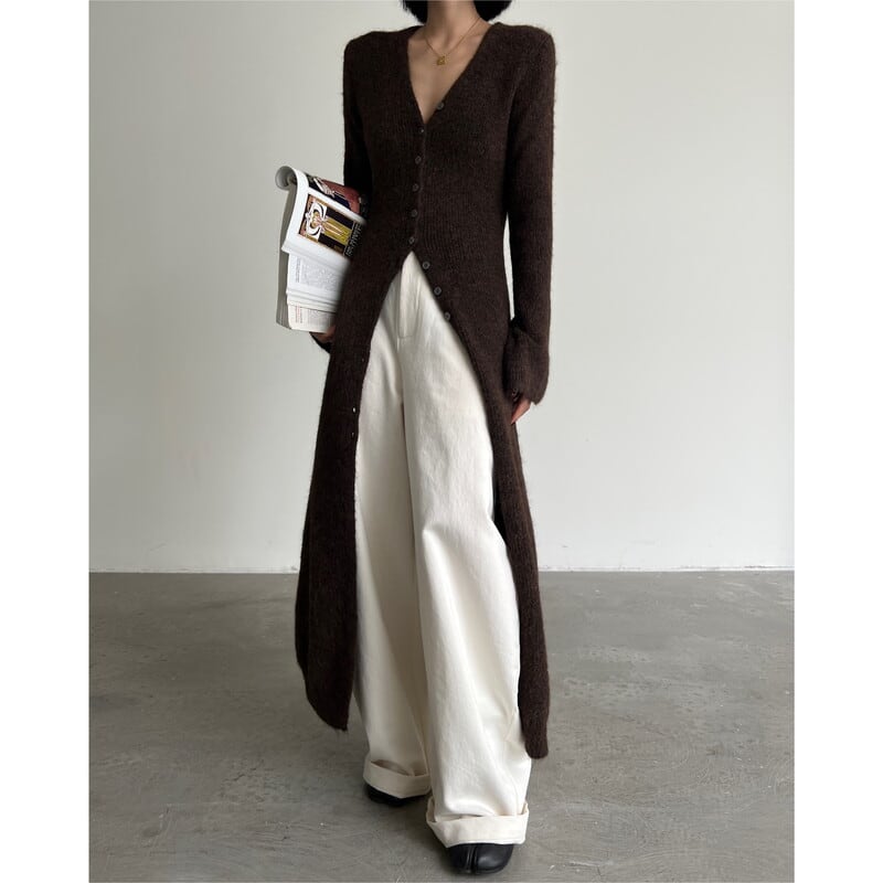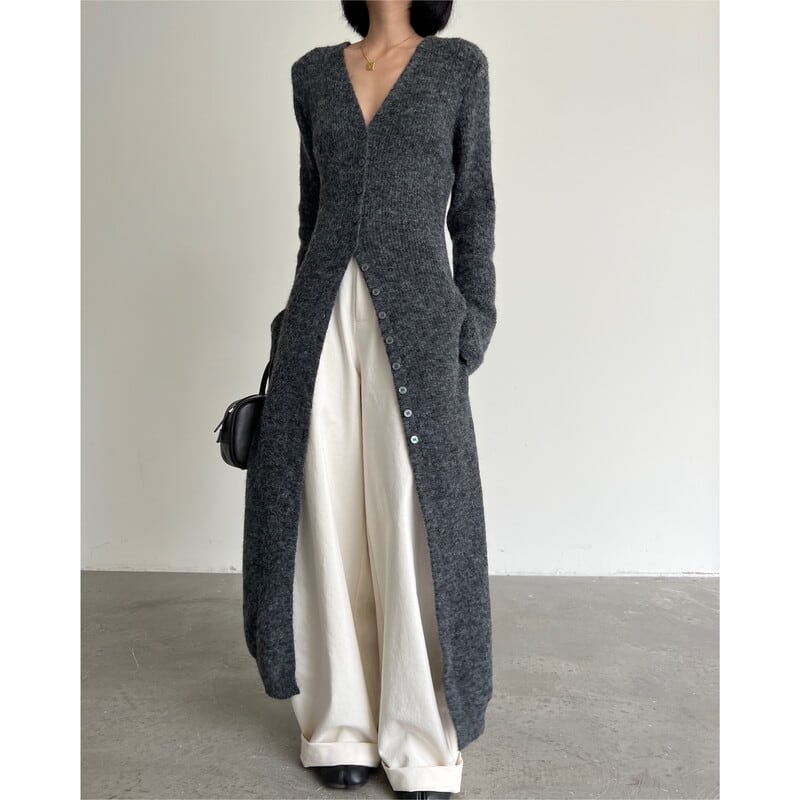 ロング丈で縦長シルエットを演出するニットカーディガン。