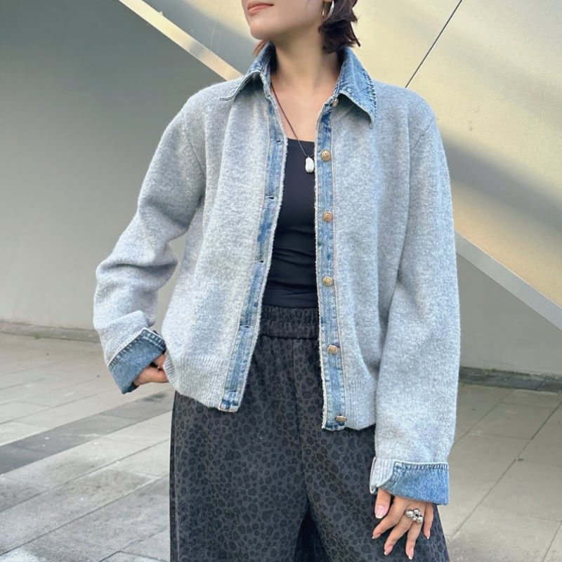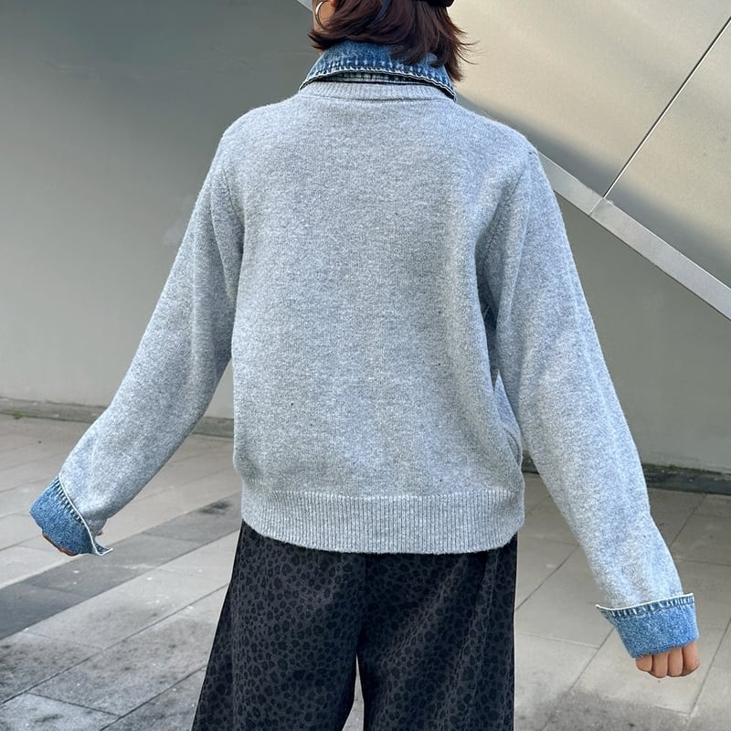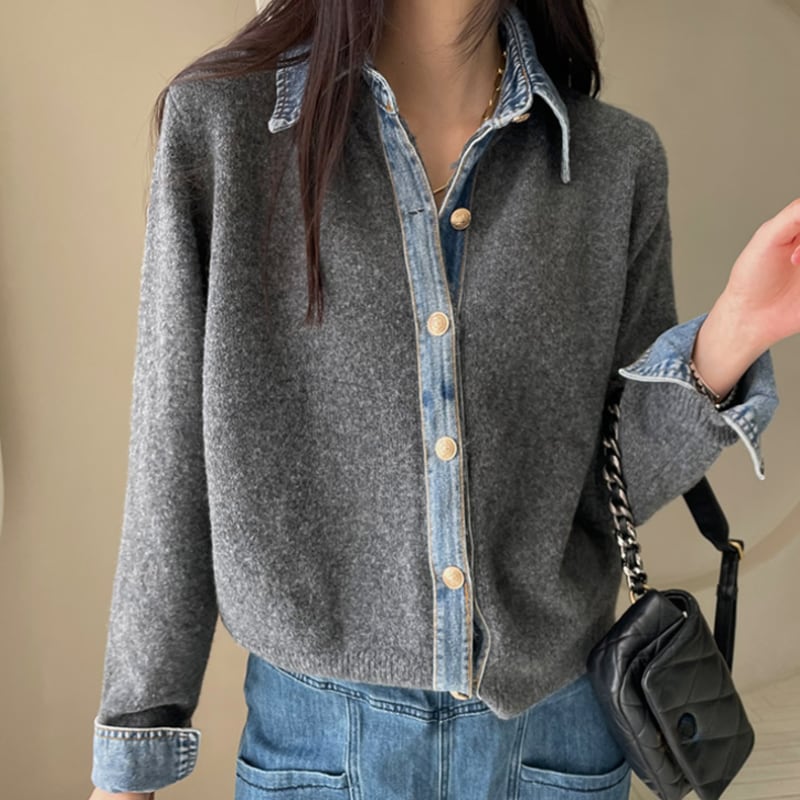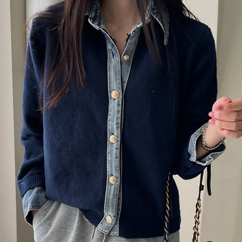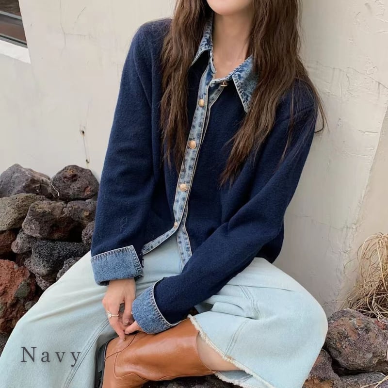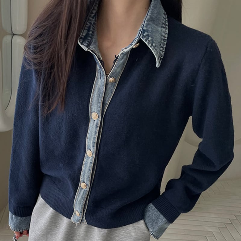 Denim collar knit cardigan 4 colors V2666