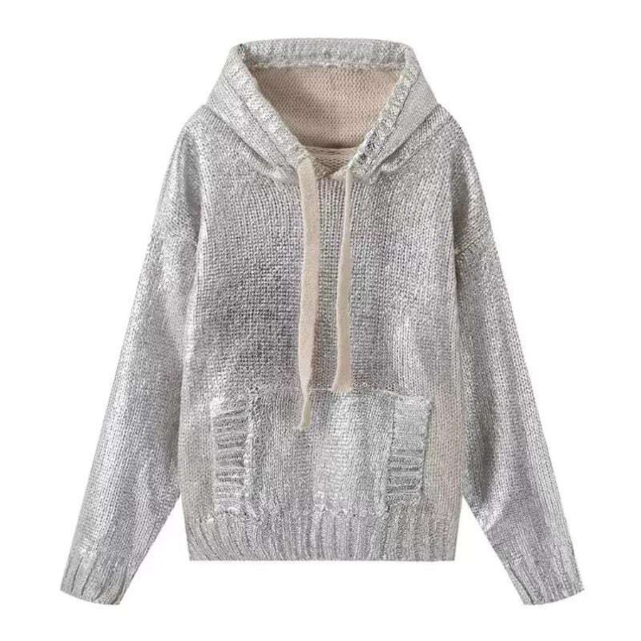 メタルカラーがこなれ感を演出してくれるニット仕立てのフーディー。