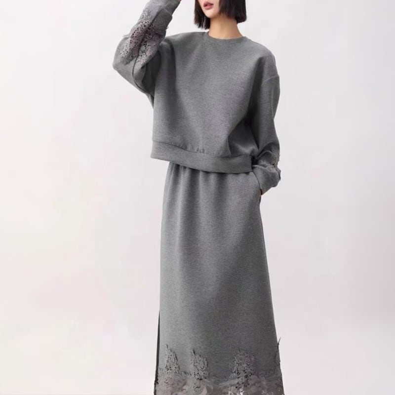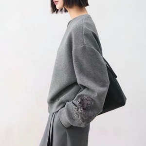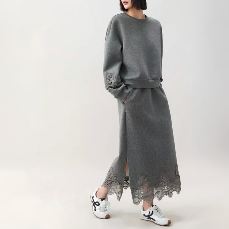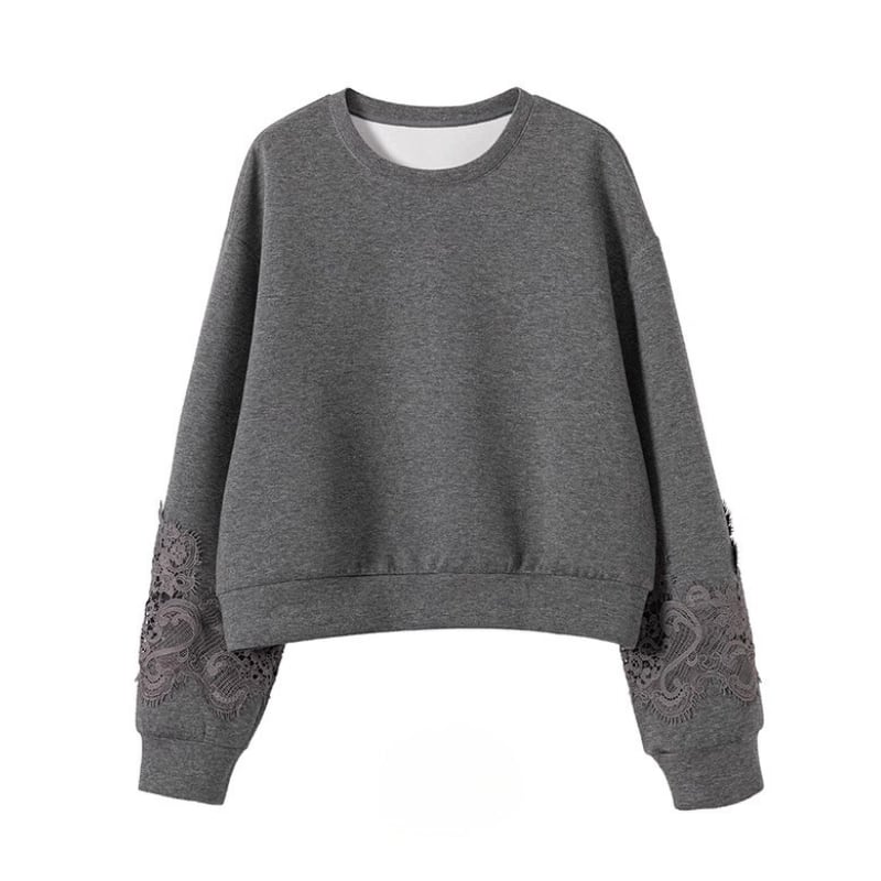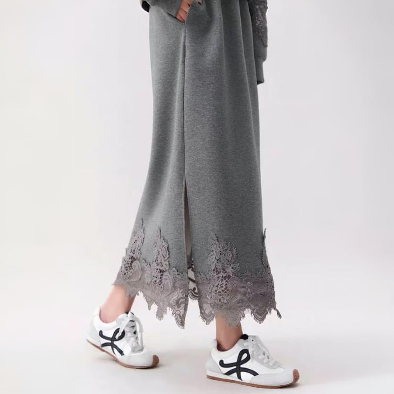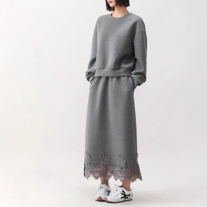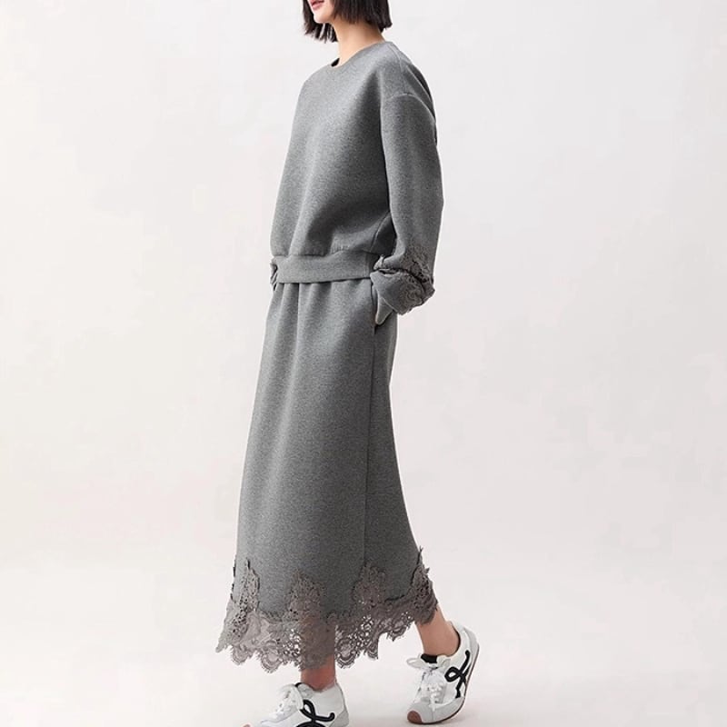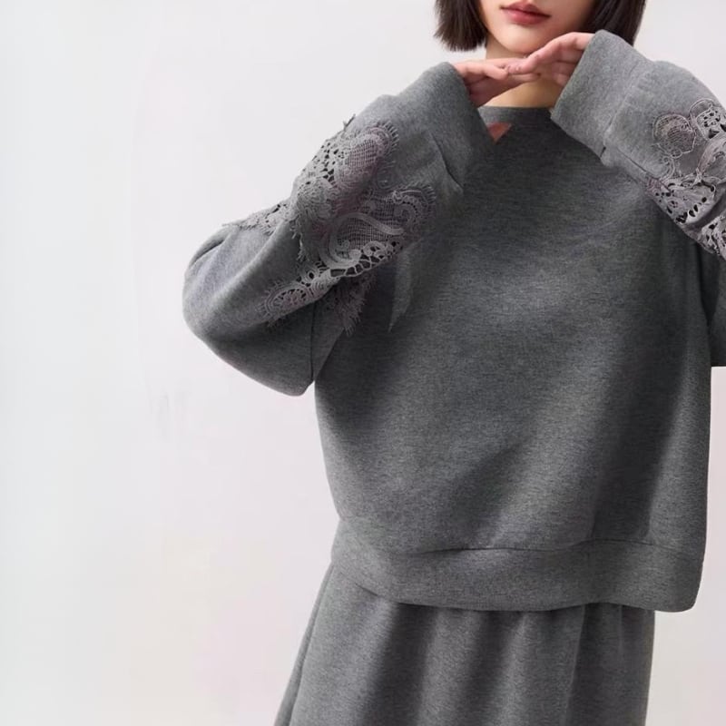 スウェットのラフさに、裾と袖口のレースディテールを重ねた、