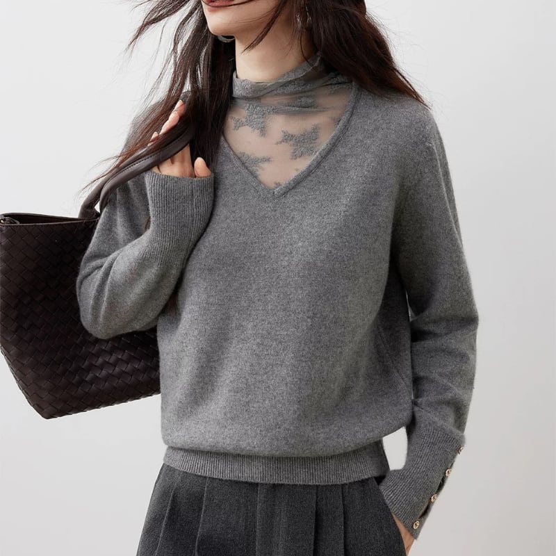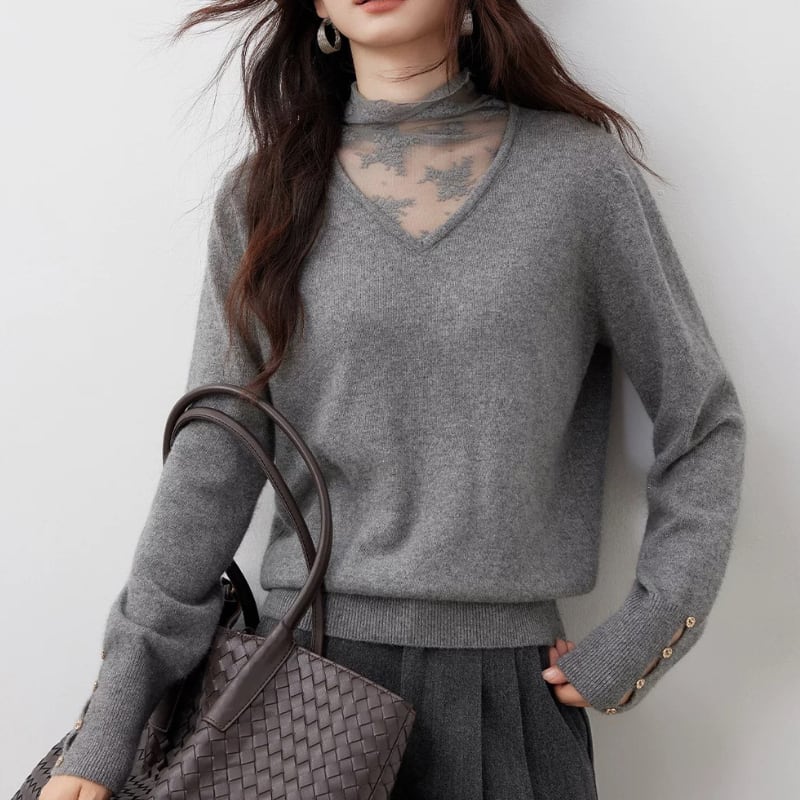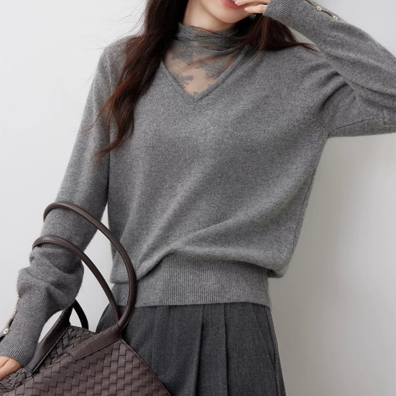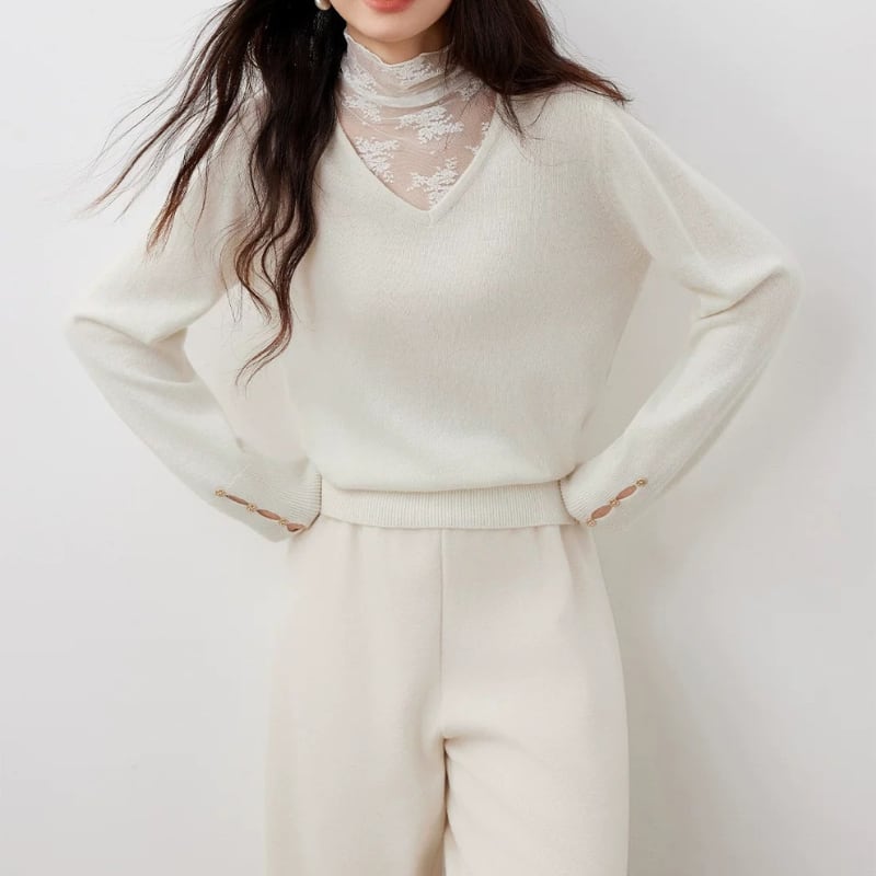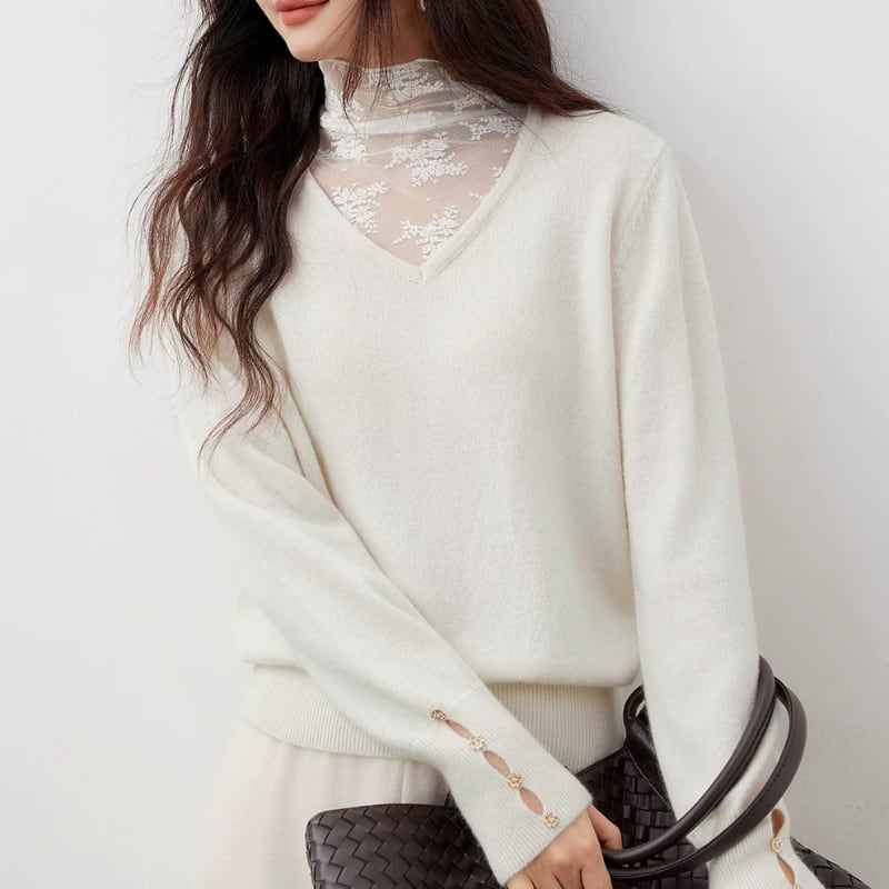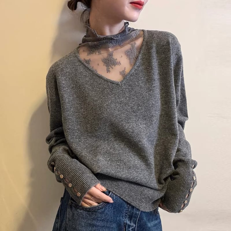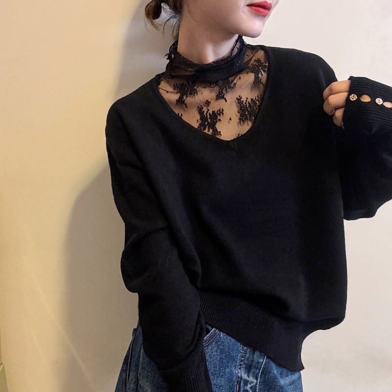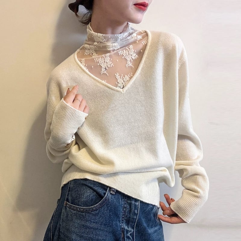 Lace ⅼayered Vneck knit tops 3colors V2795