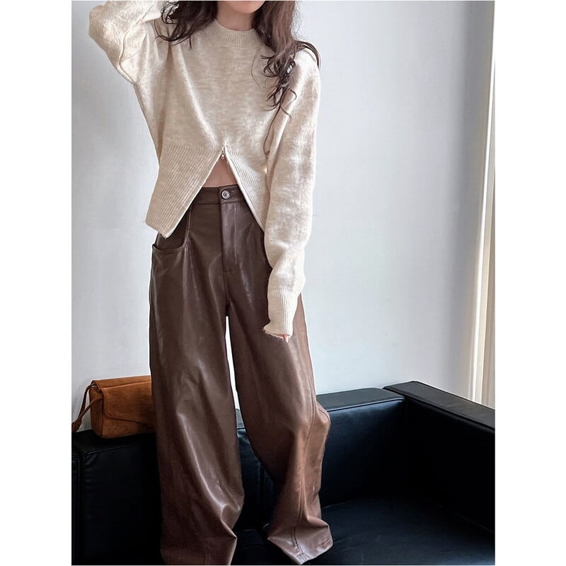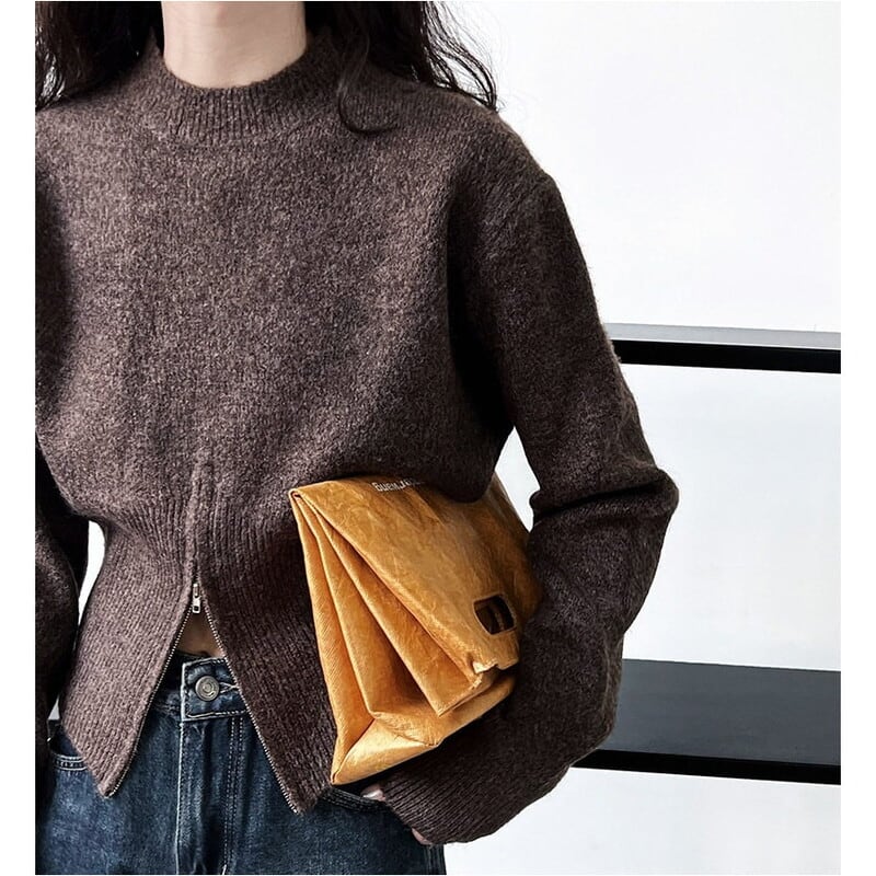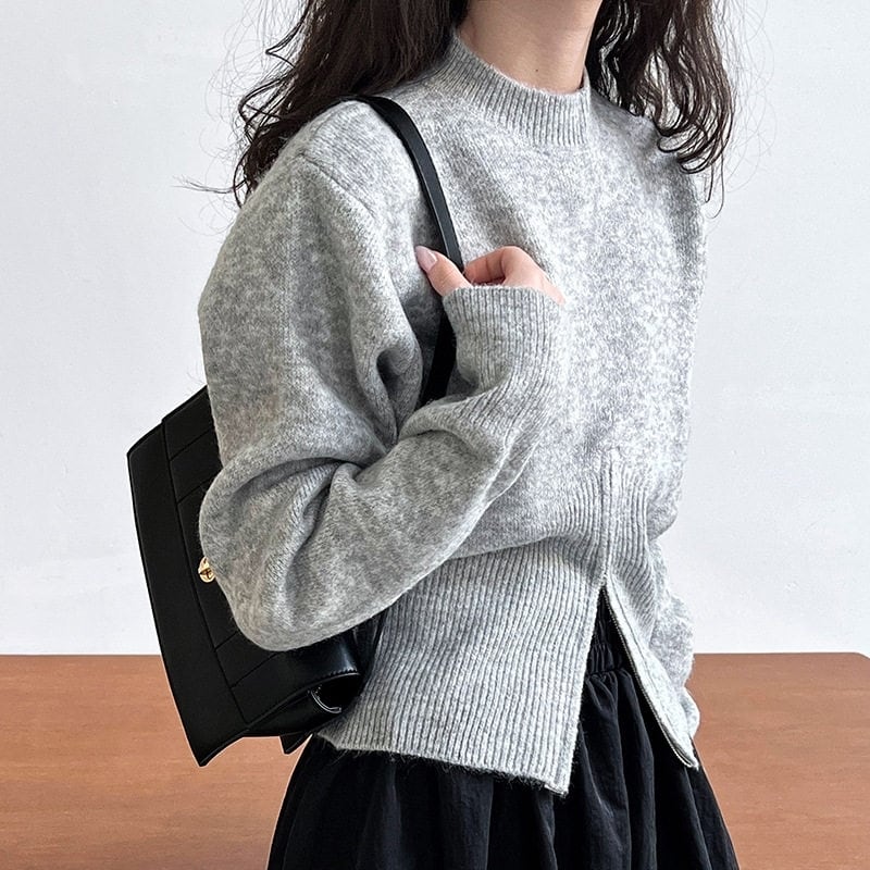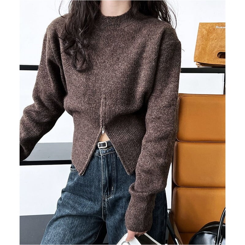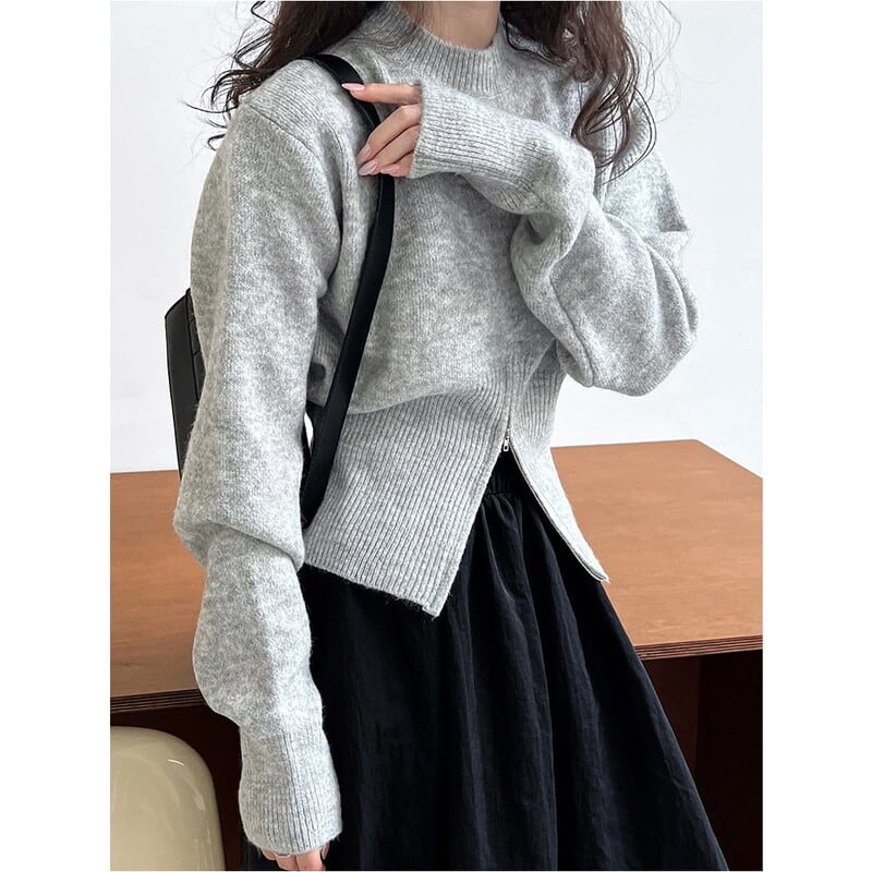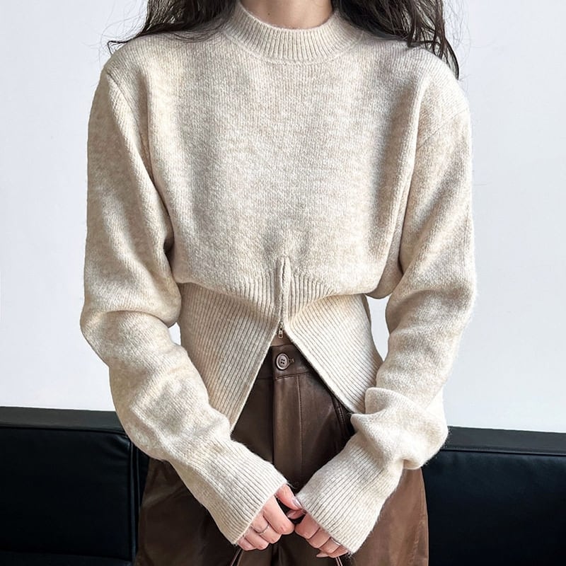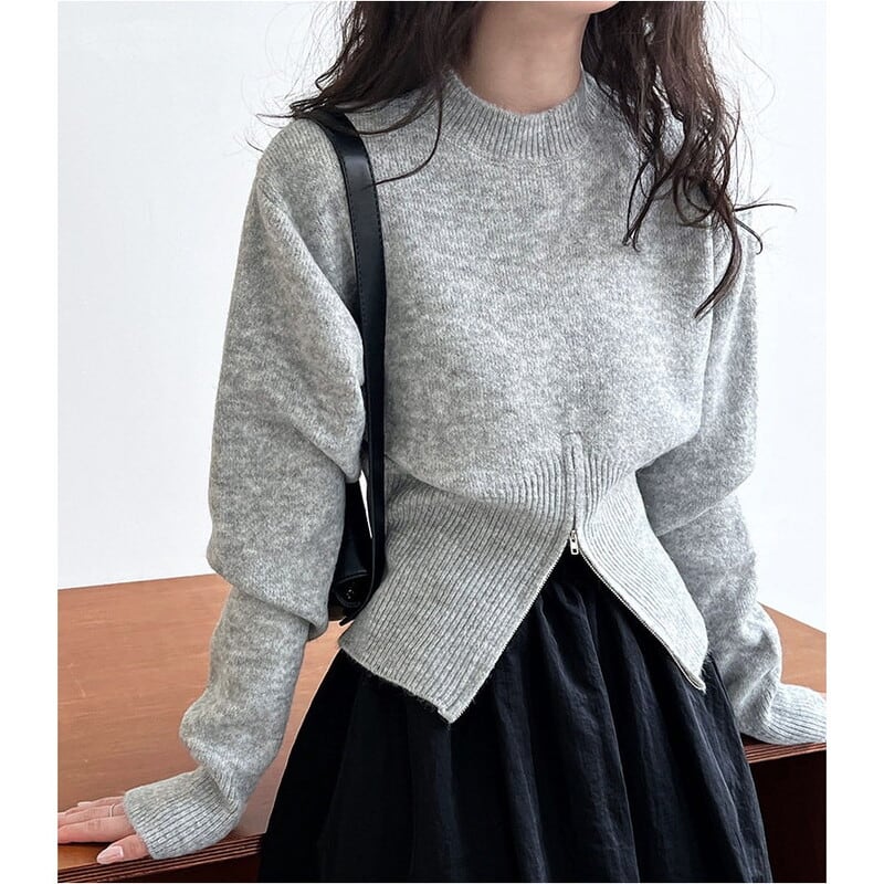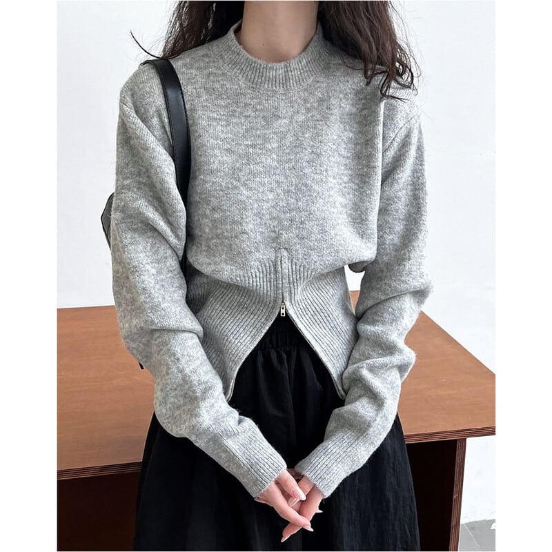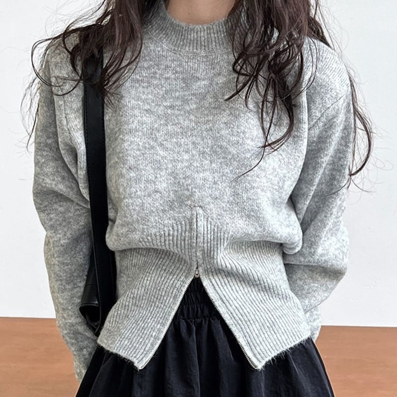 ジップアップのヘムデザインがポイントのニット。