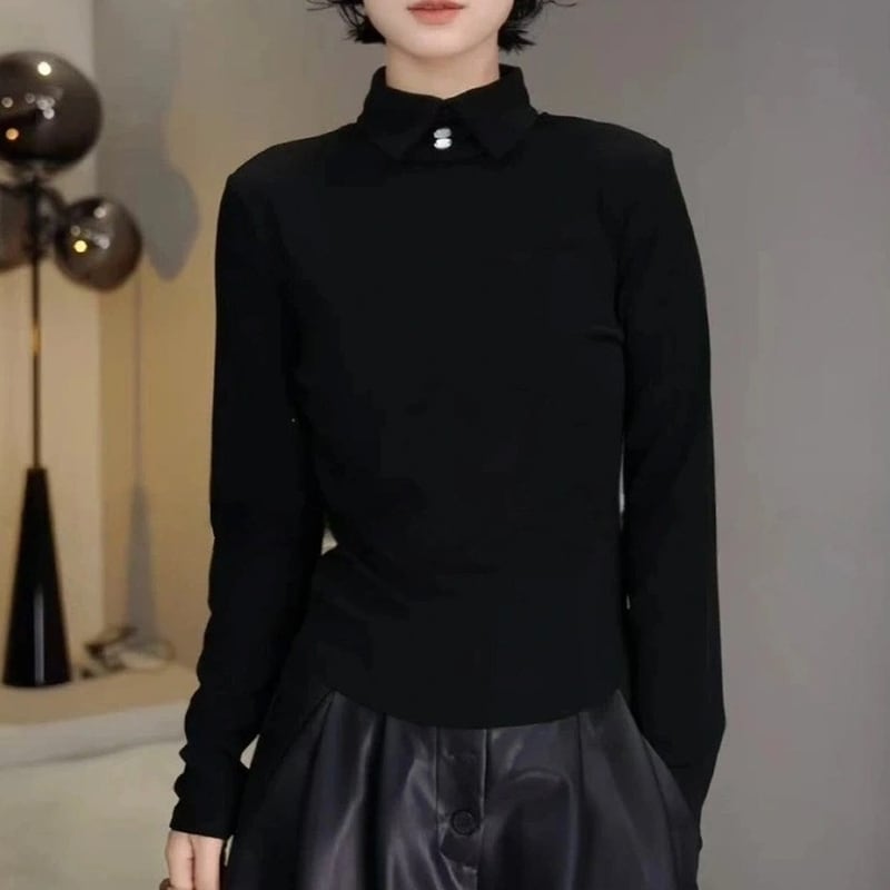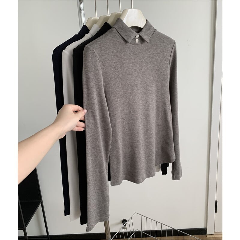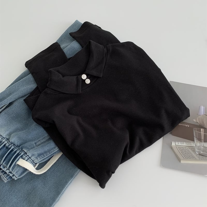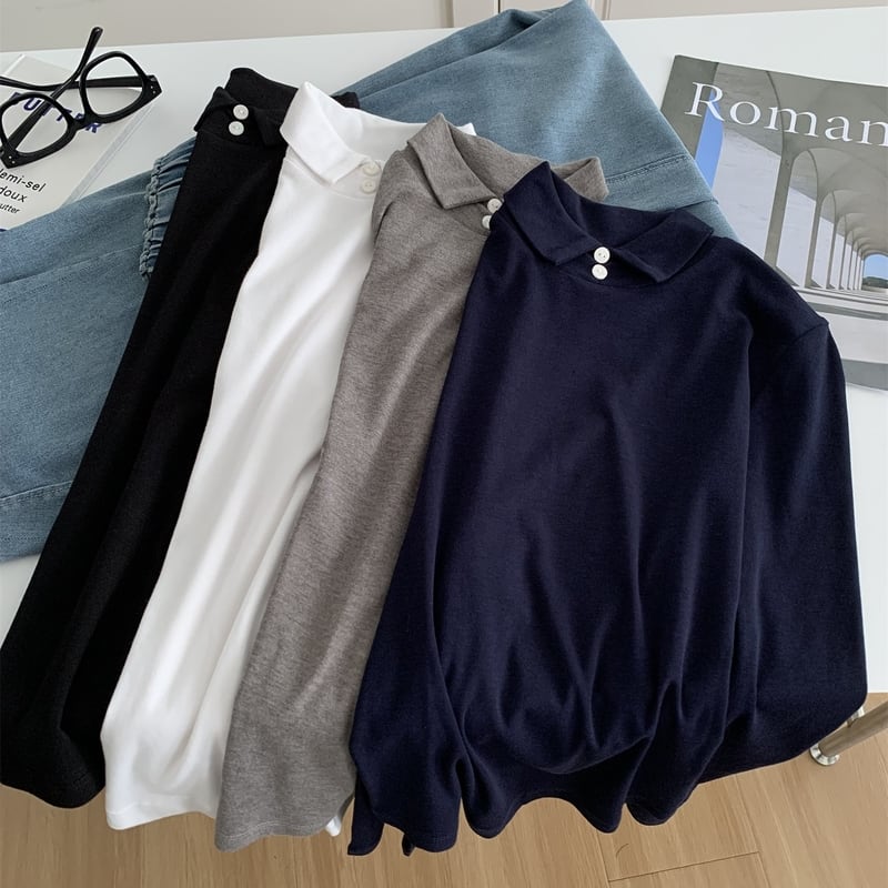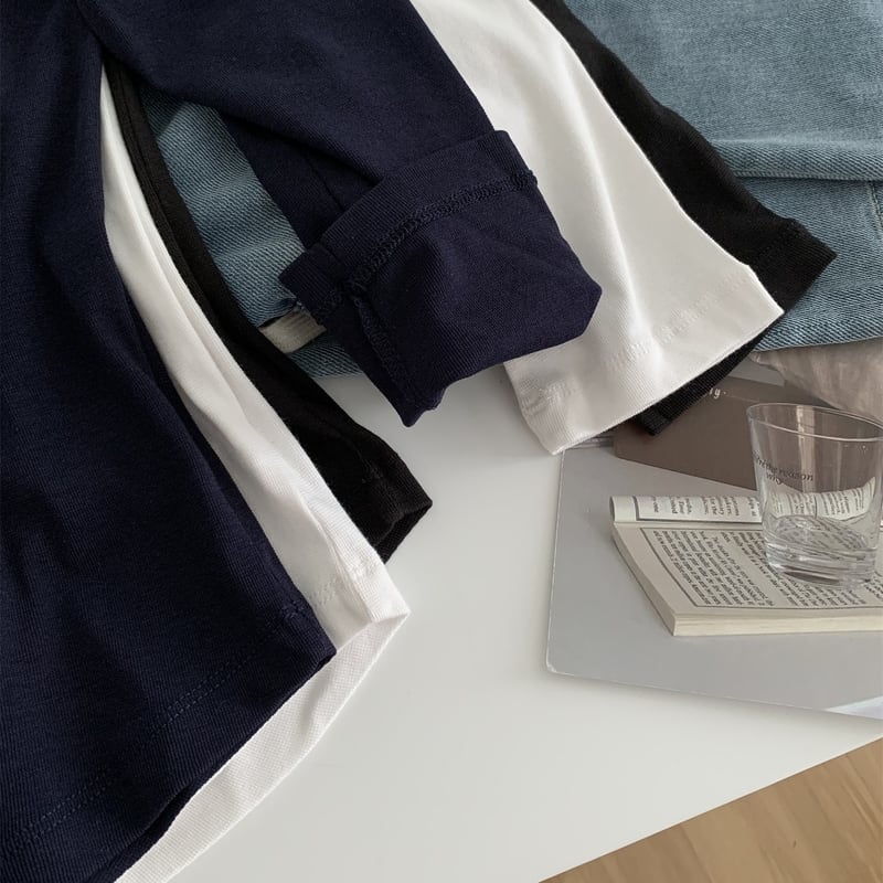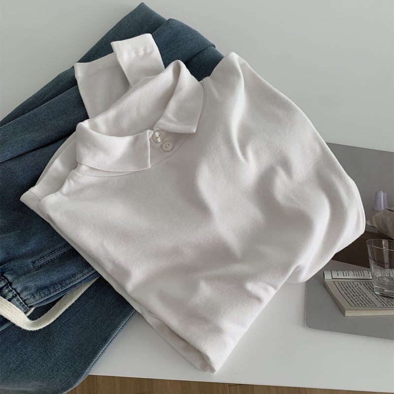 シンプルなデザインで着回し力抜群の襟つきハイネックトップス。