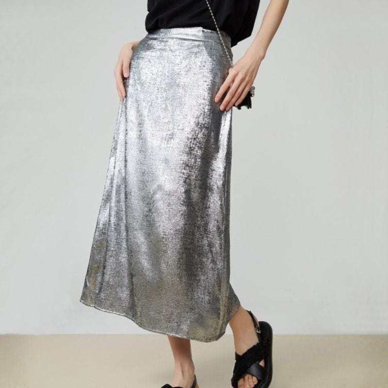 遊び心のあるメタリックシルバーのバックスリットスカート。