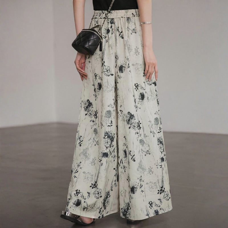 淡いベースにモノトーンのフラワー柄をのせたワイドパンツ。