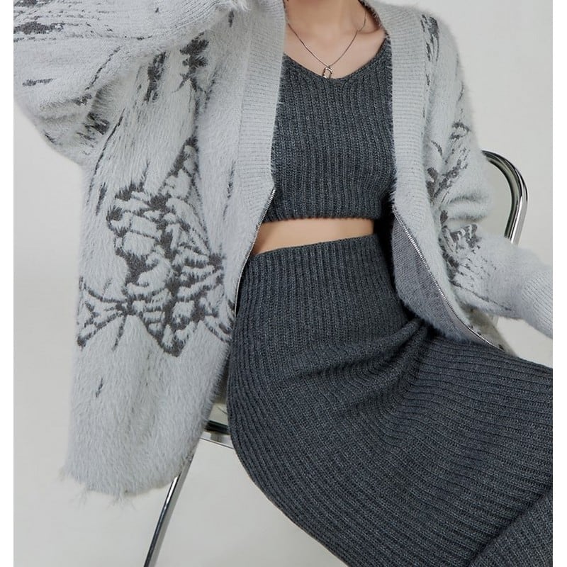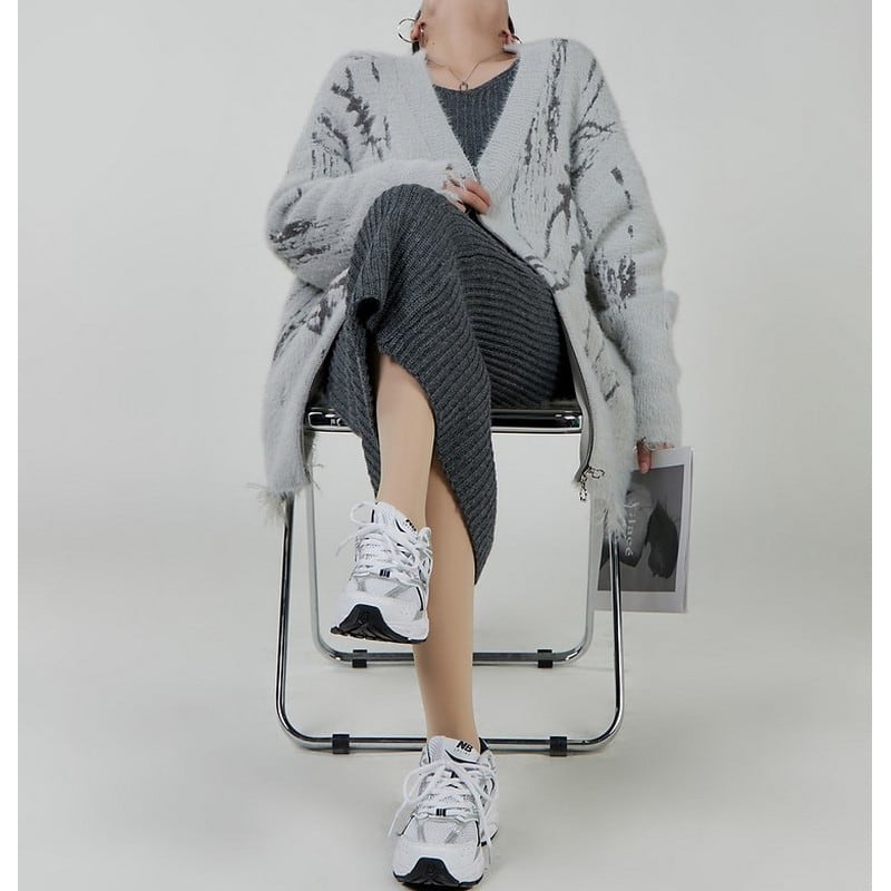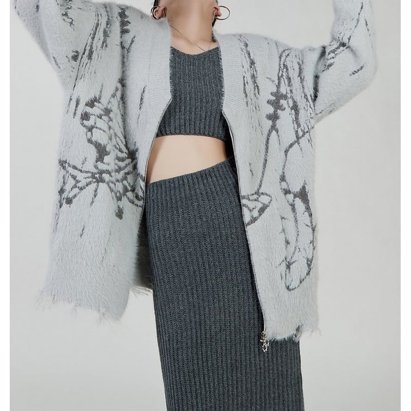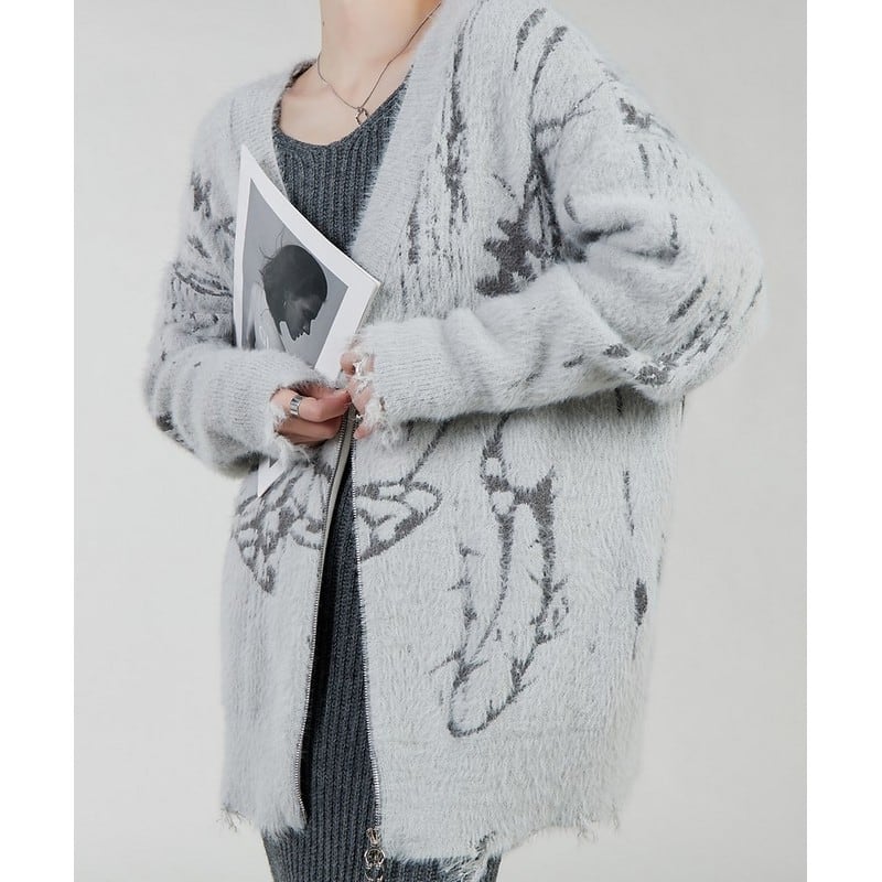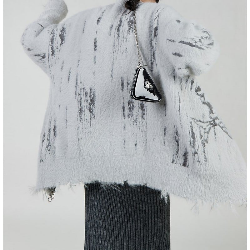 抽象柄とダメージ加工の袖口と裾が特徴の大きめカーディガン。