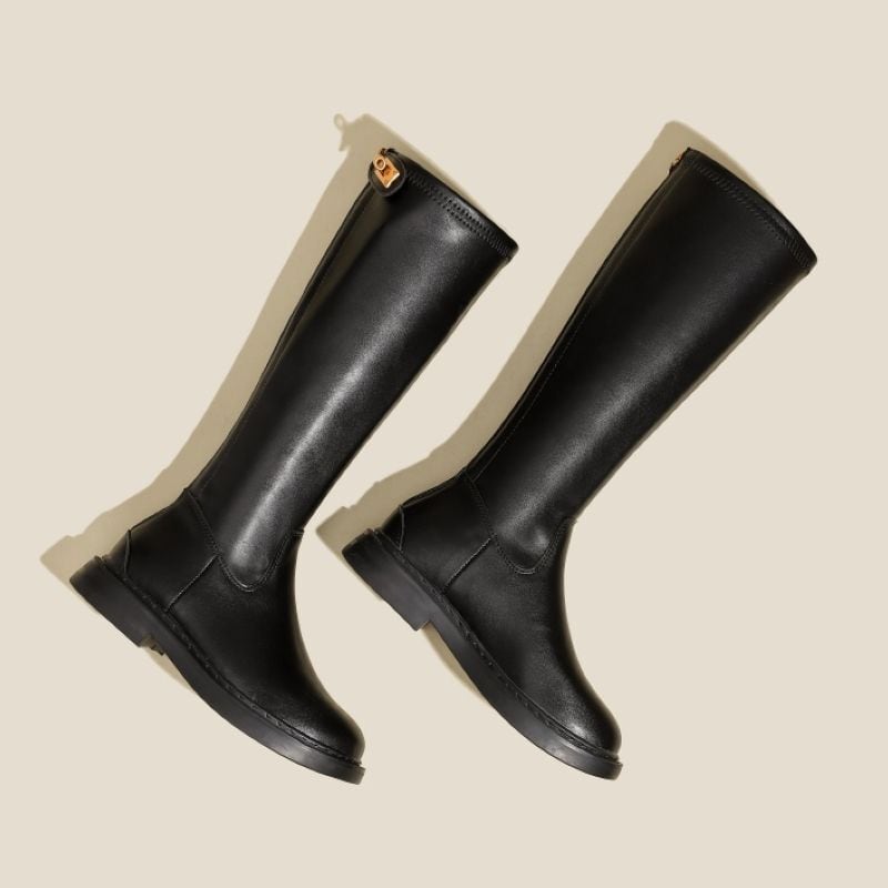 履き口の留め具が高見えするデザインロングブーツ。