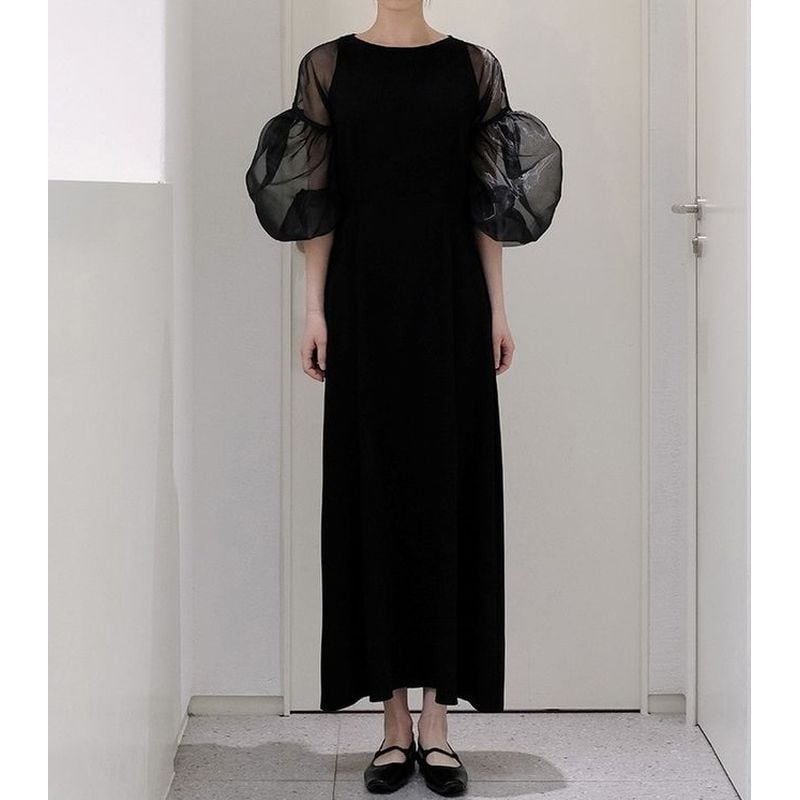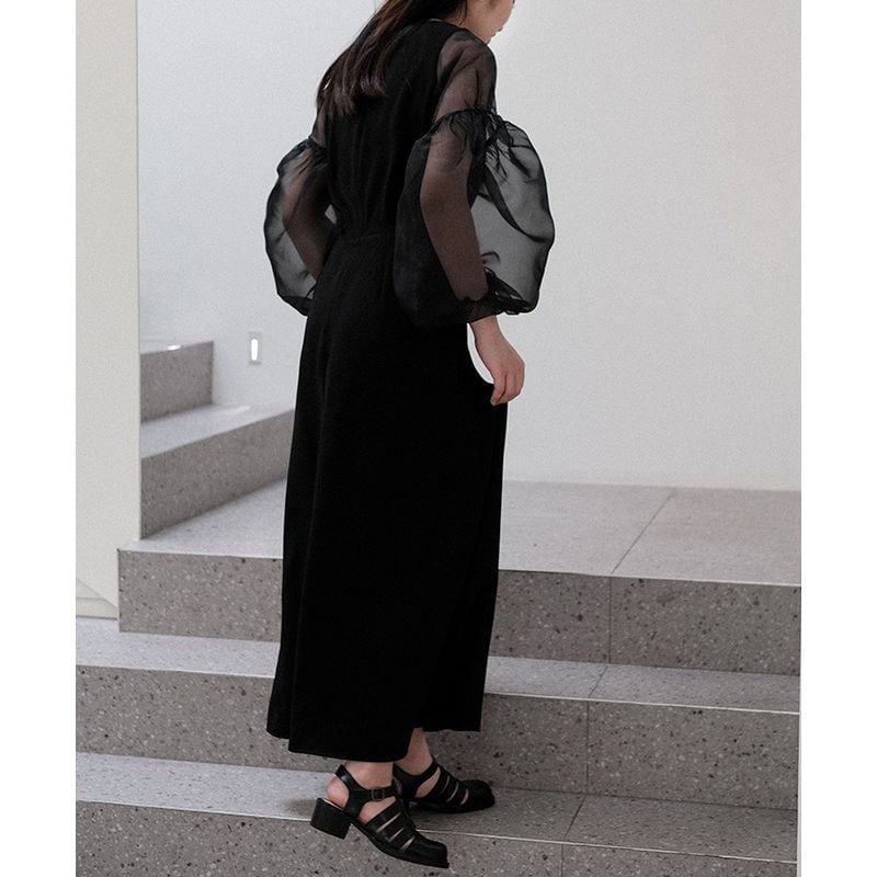 シアーのパフスリーブが目を惹くブラックワンピース。