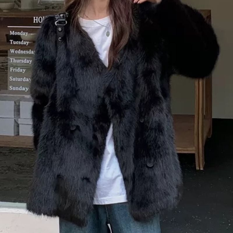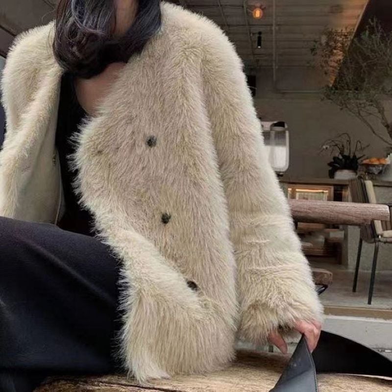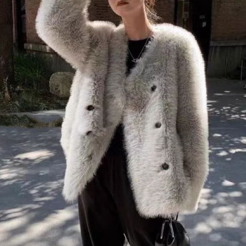 季節感の出るファー素材で、着膨れしないジャケット調がポイント。