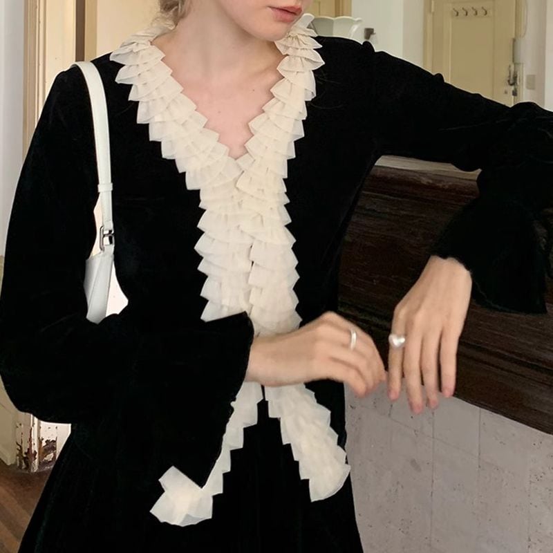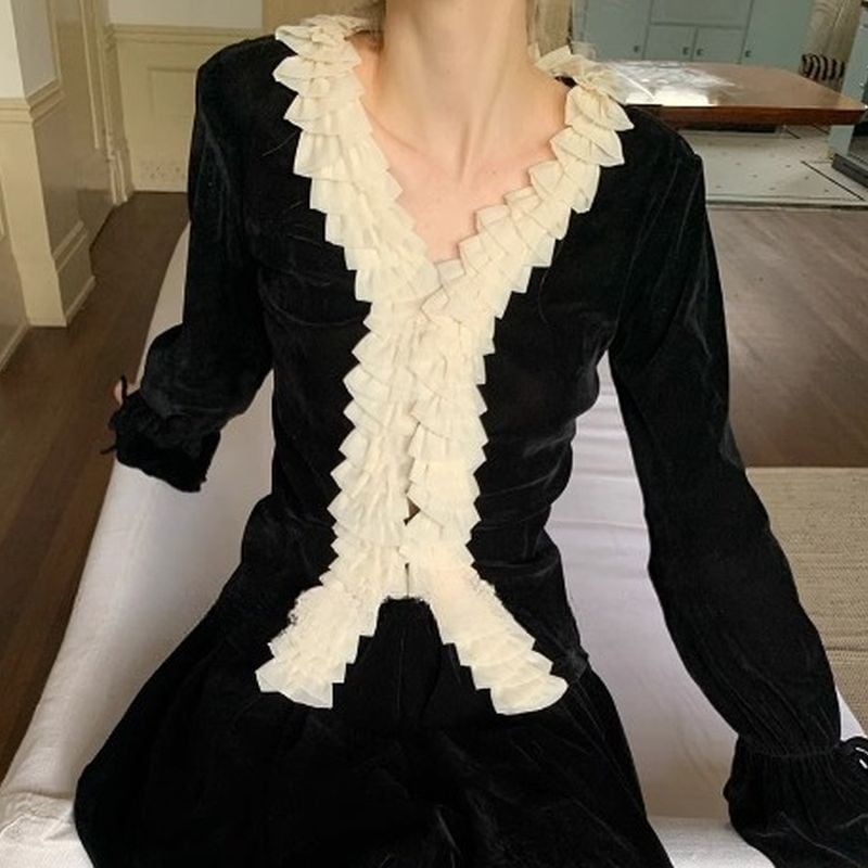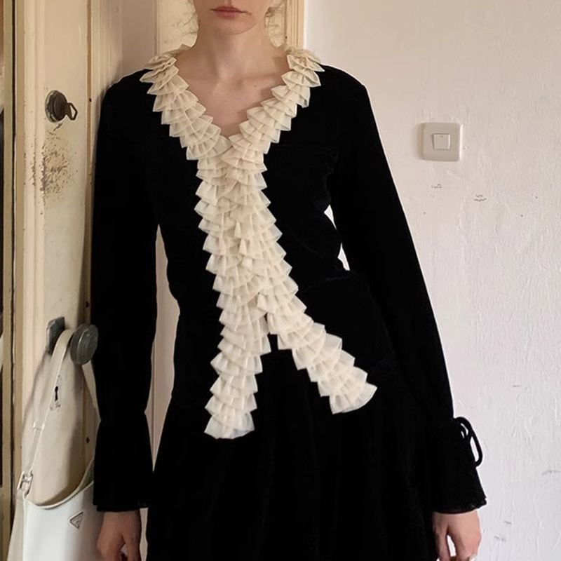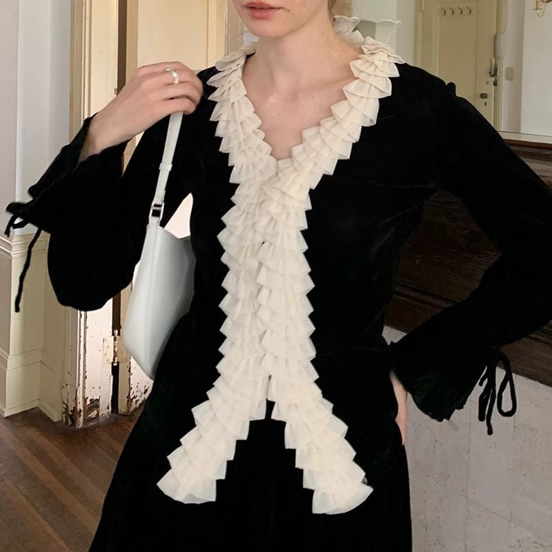 品よく折り重なったプリーツとリボン付きのベルスリーブ、