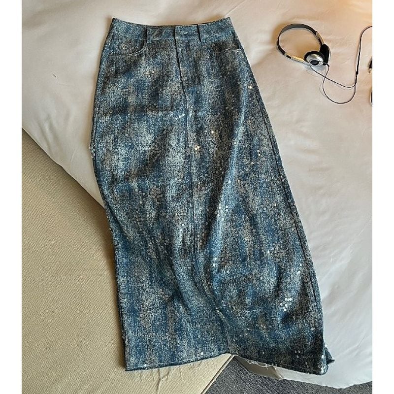 Sequin denim long skirt V1493
