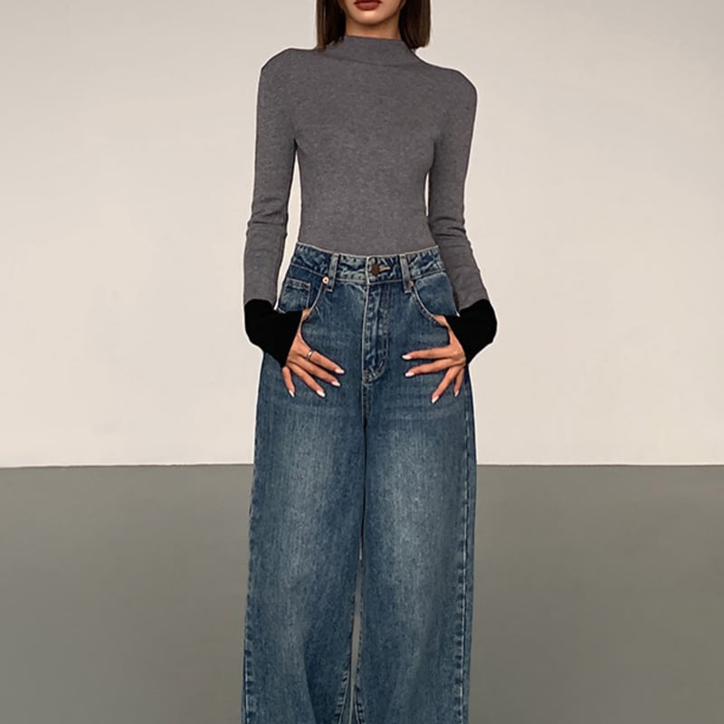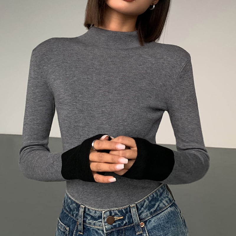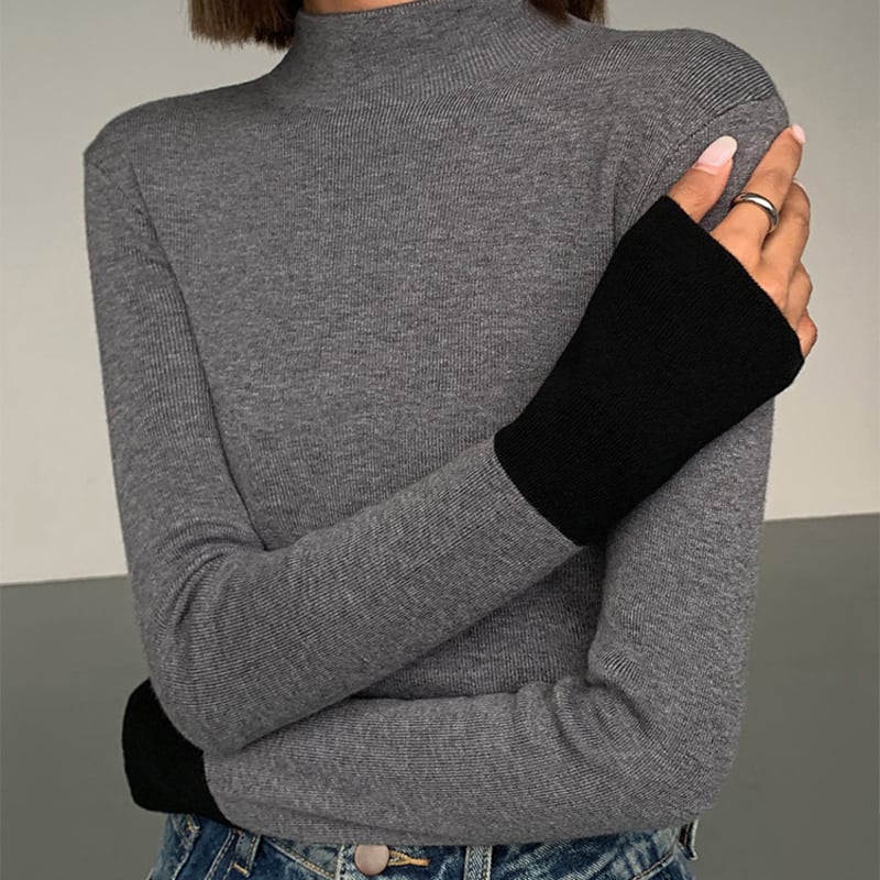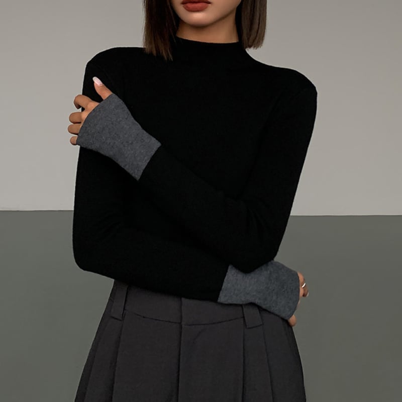 袖部分のカラーブロックが個性的でモードな印象をプラス。