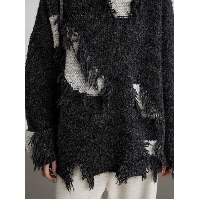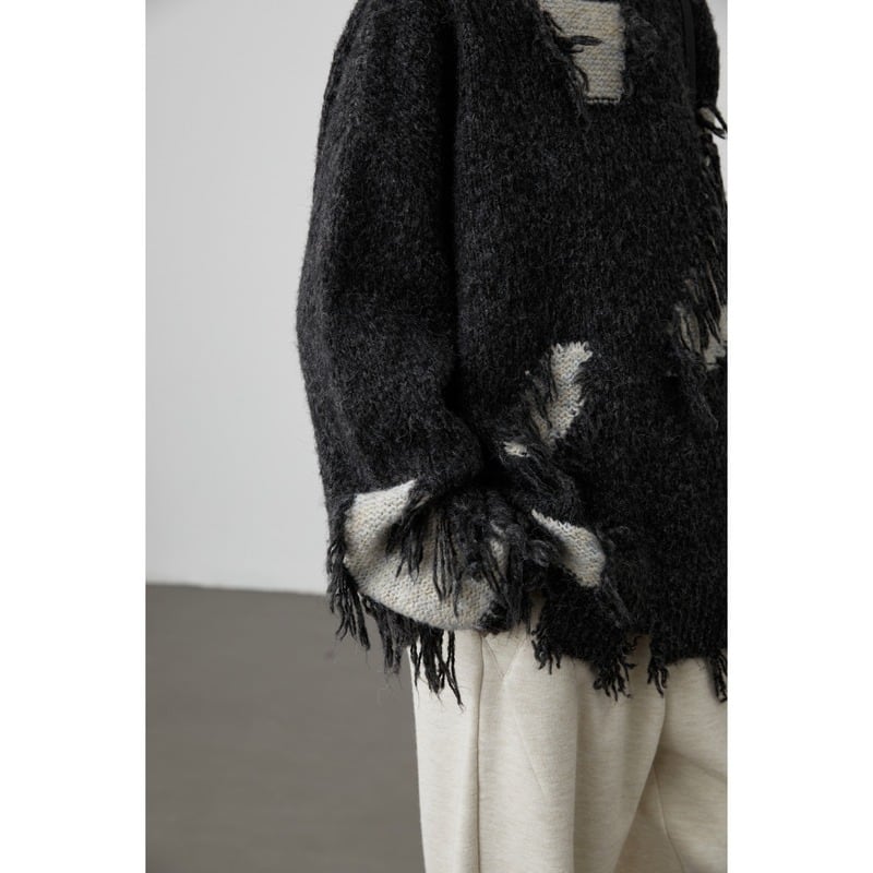 アシンメトリーデザインにダメージ加工を施したニットトップス。