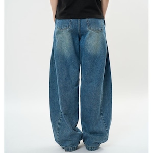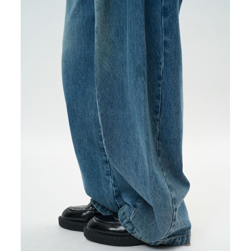 脚のラインが出ないワイドなシルエットが特徴的なデニムパンツ。