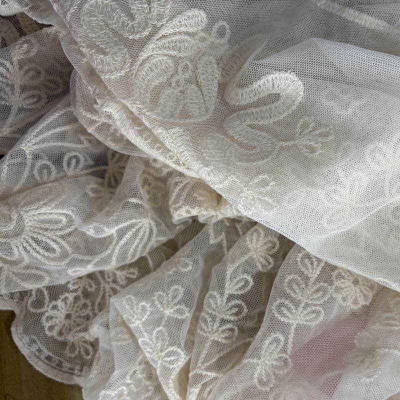 全体に入ったレース刺繍や裾のスカラップが美しい、